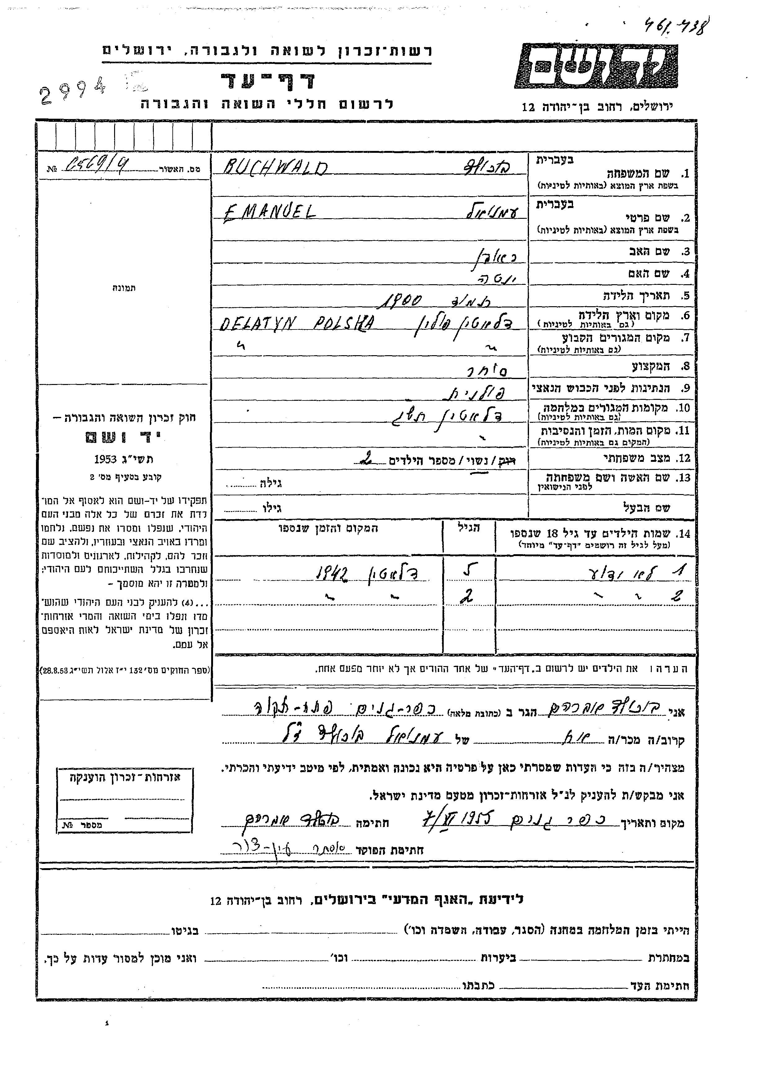 Emanuel Buchwald Bukhold wurde im Jahr 1900 in Delatyn, Polen geboren. Er war der Sohn von Reuven und Yenta. Er war Kaufmann/-frau und mit Sara Verheiratet. Vor dem Zweiten Weltkrieg lebte er in Delatyn, Polen. Während des Krieges war er in Delatyn, Polen.