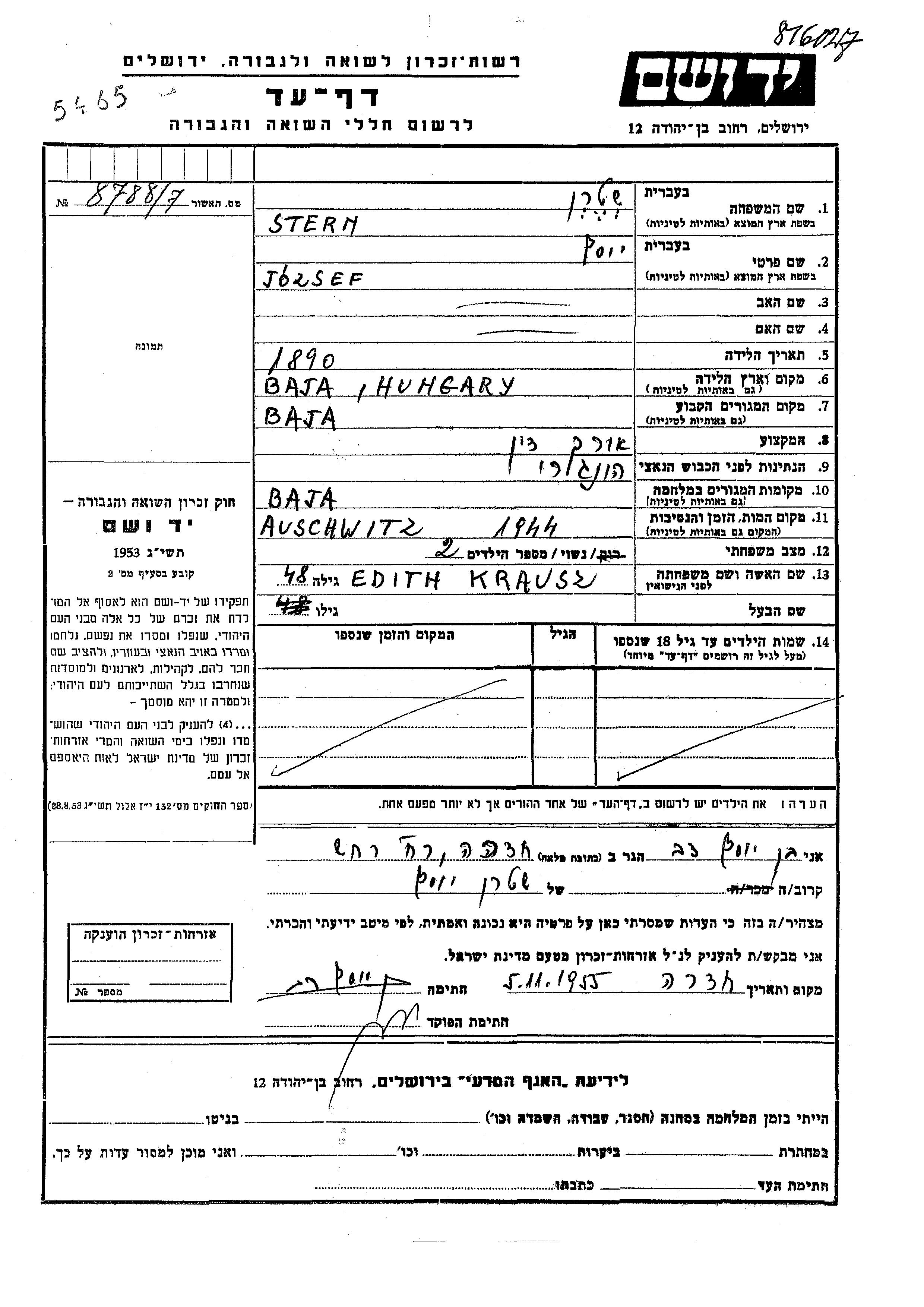 Jozsef Stern wurde im Jahr 1890 in Baja, Ungarn geboren. Er war Rechtsanwalt/rechtsanwältin und mit Edith, geb. Krausz Verheiratet. Vor dem Zweiten Weltkrieg lebte er in Baja, Ungarn. Während des Krieges war er in Baja, Ungarn.