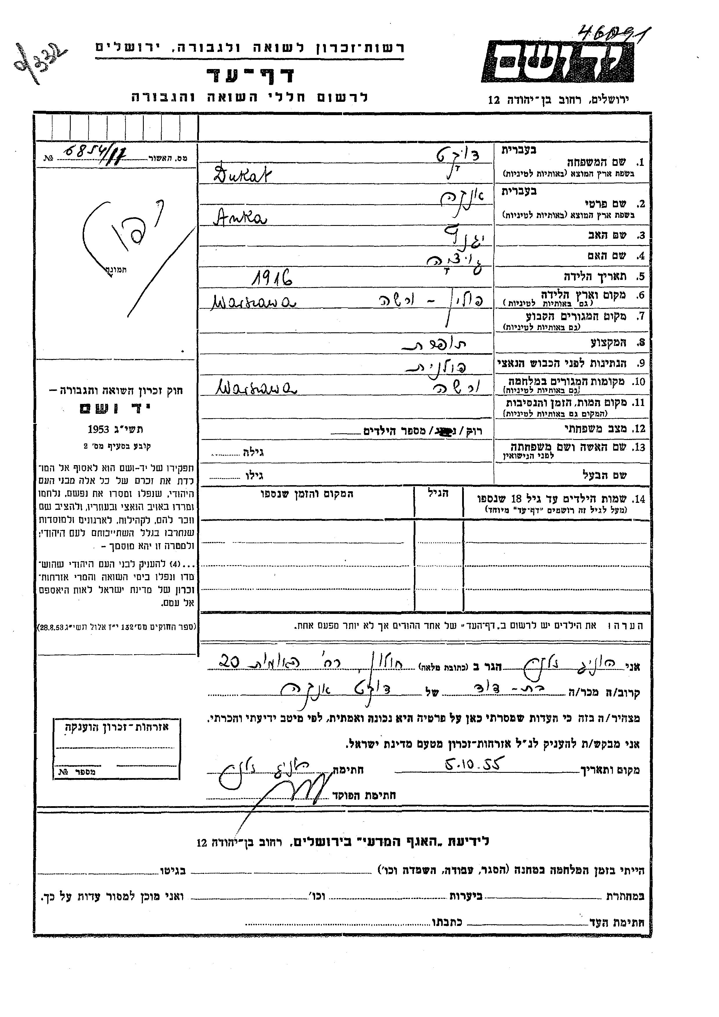 Anka Dukat wurde im Jahr 1916 in Warsaw, Polen geboren. Sie war die Tochter von Ignatz und Gucha. Sie war Schneiderin und Ledig. Während des Krieges war sie in Warsaw, Polen.