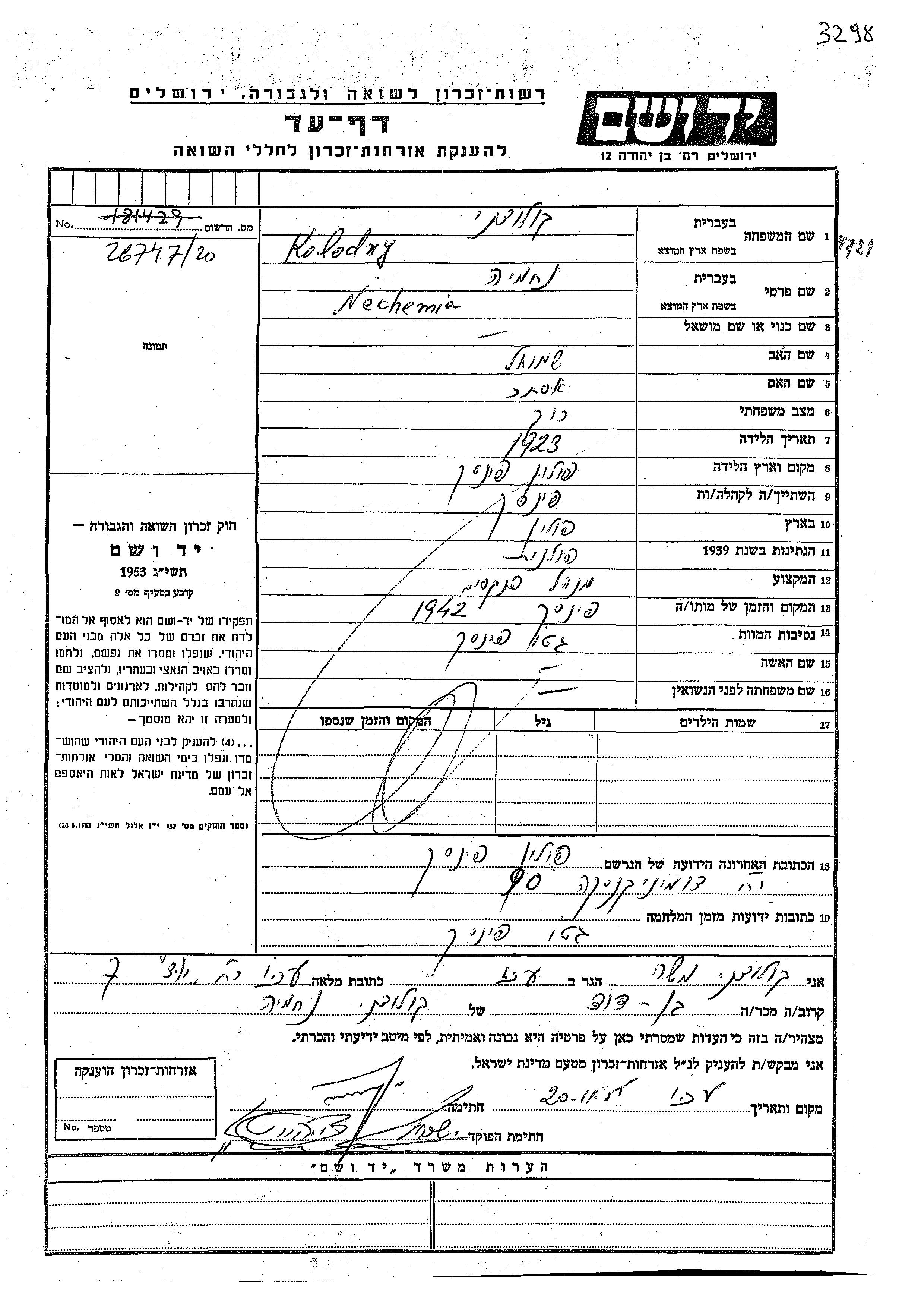 Nechemia Kolodny wurde im Jahr 1923 in Pinsk, Polen geboren. Er war der Sohn von Shmuel und Ester. Er war Buchhalter/-in und Ledig. Während des Krieges war er in Pinsk, Polen.
