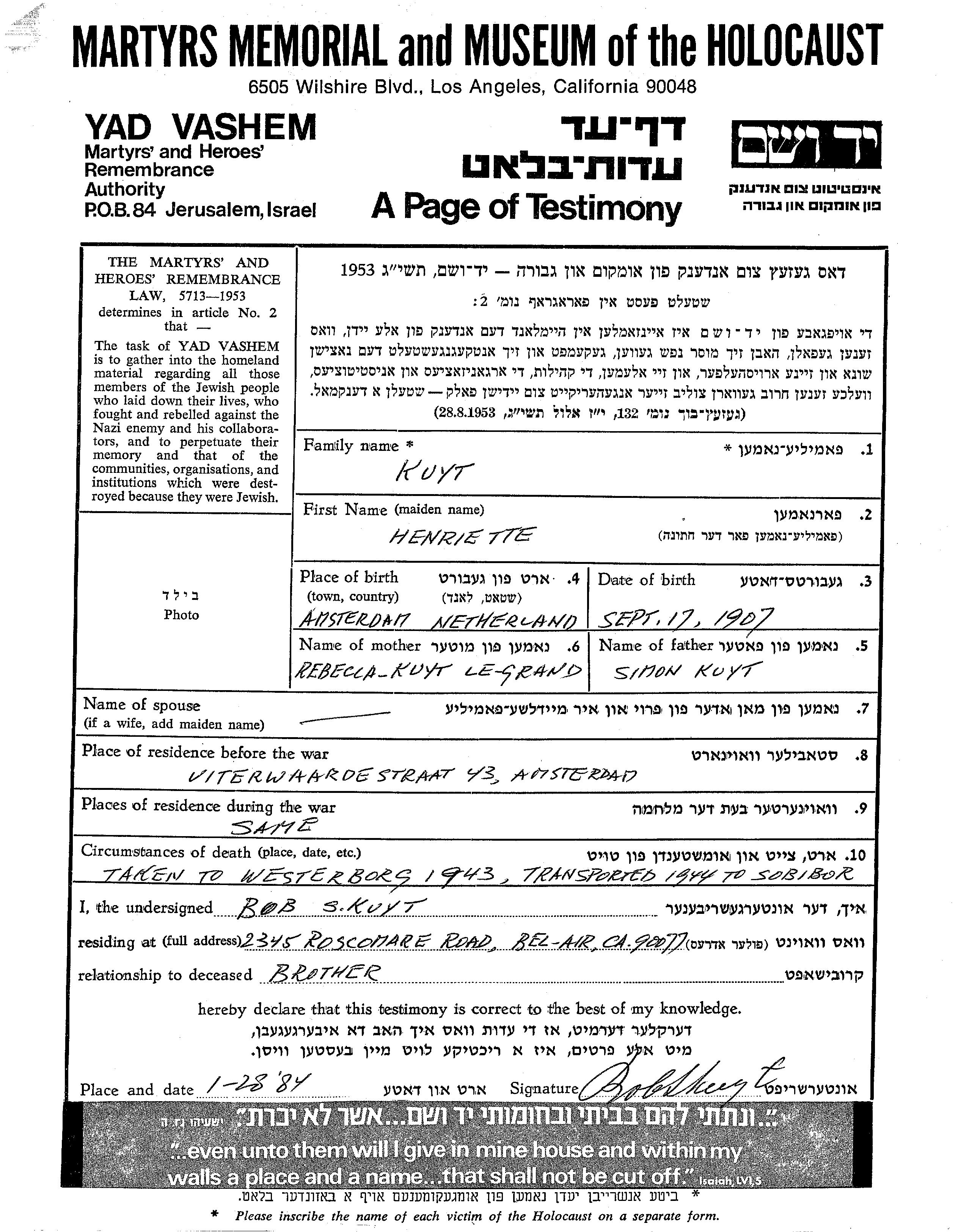 Henriette Kuyt wurde im Jahr 1907 in Amsterdam, Niederlande geboren. Sie war die Tochter von Simon und Rebecca. Vor dem Zweiten Weltkrieg lebte sie in Amsterdam, Niederlande. Während des Krieges war sie in Amsterdam, Niederlande.