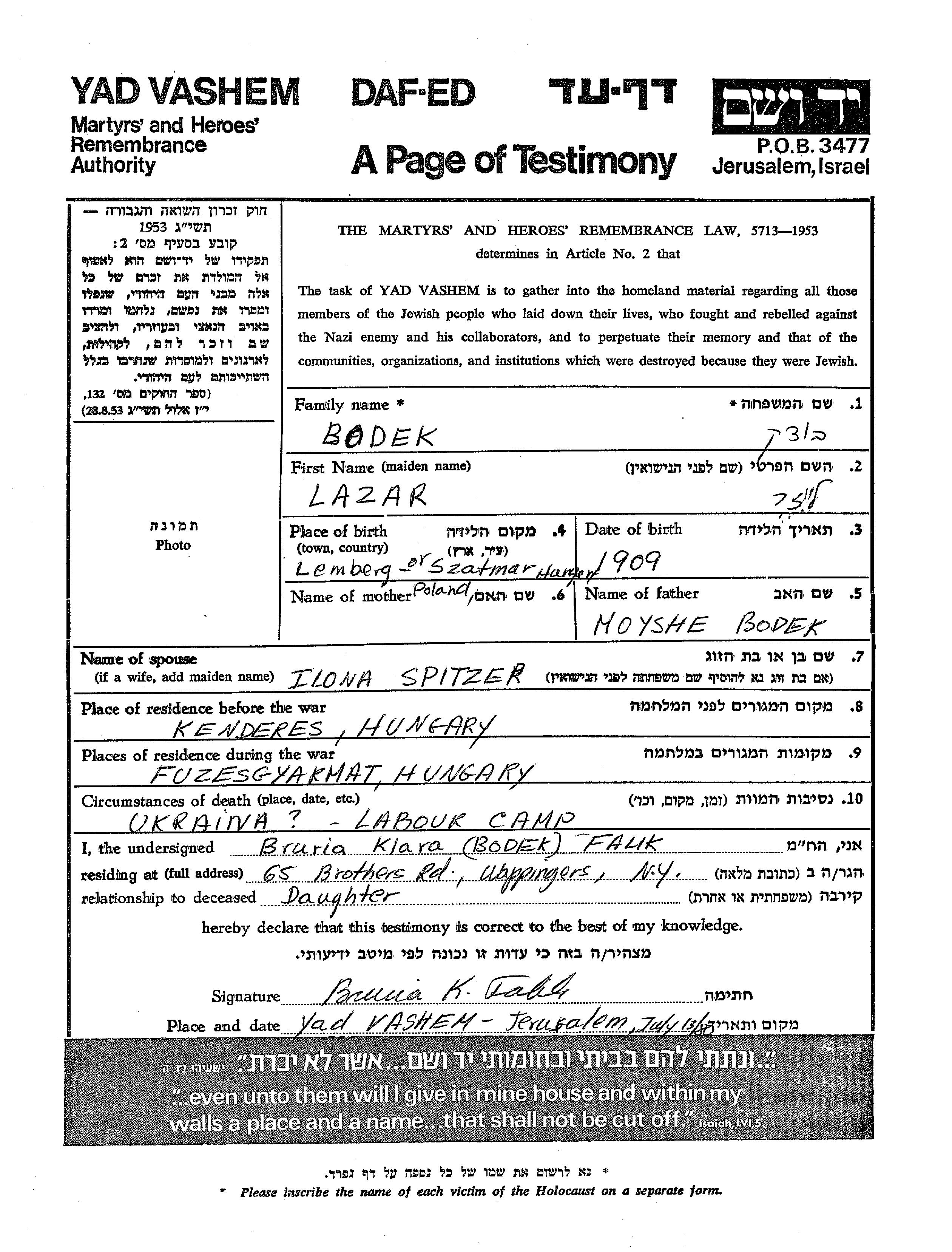 Lazar Bodek wurde im Jahr 1909 in Lemberg, Polen geboren. Er war der Sohn von Moyshe. Er war mit Ilona, geb. Spitzer Verheiratet. Vor dem Zweiten Weltkrieg lebte er in Kenderes, Ungarn. Während des Krieges war er in Fuzesgyarmat, Ungarn.