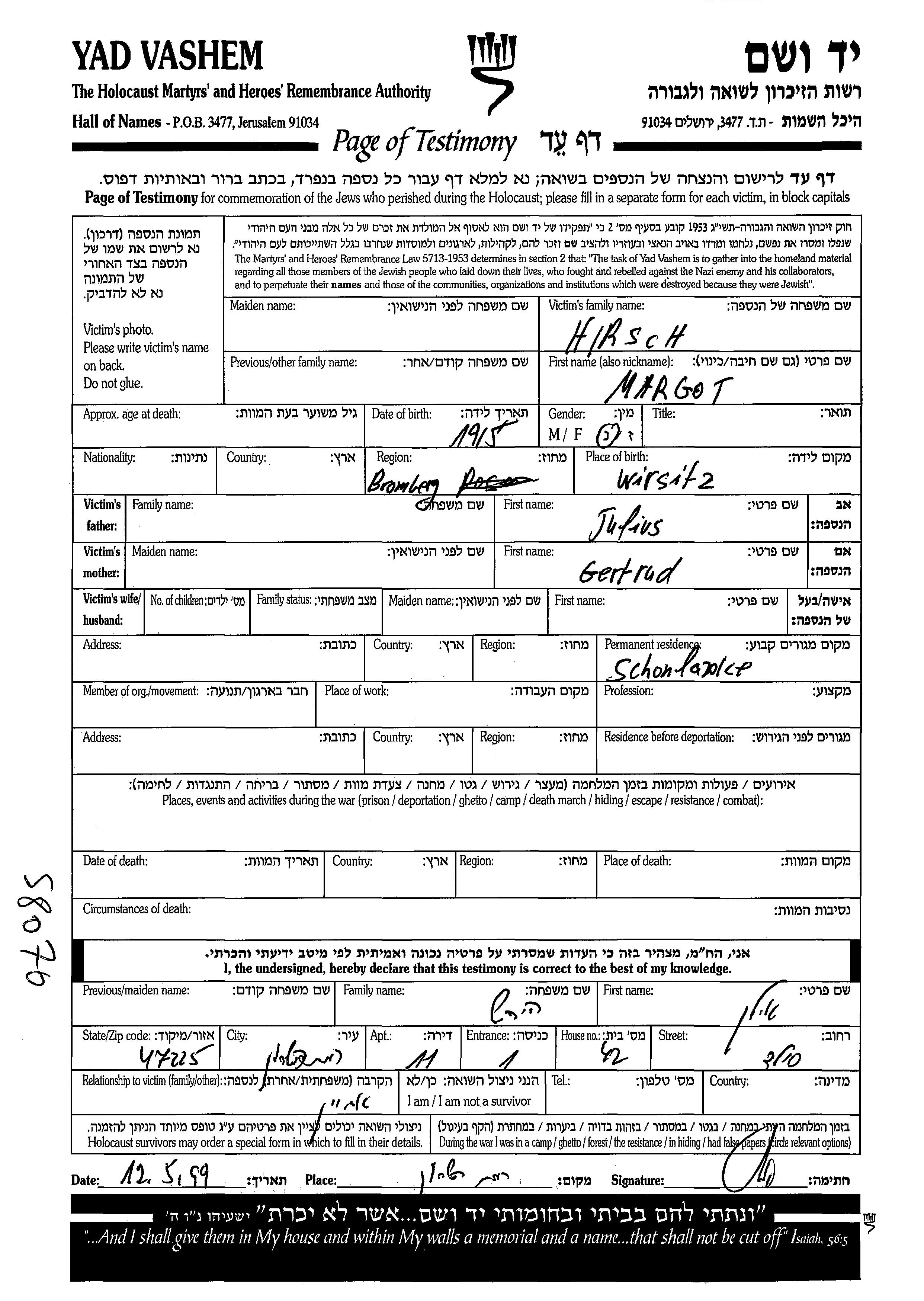 Margot Hirsch wurde im Jahr 1915 in Wirsitz, Polen geboren. Sie war die Tochter von Julius und Gertrud. Vor dem Zweiten Weltkrieg lebte sie in Schoenlanke, Deutsches Reich.