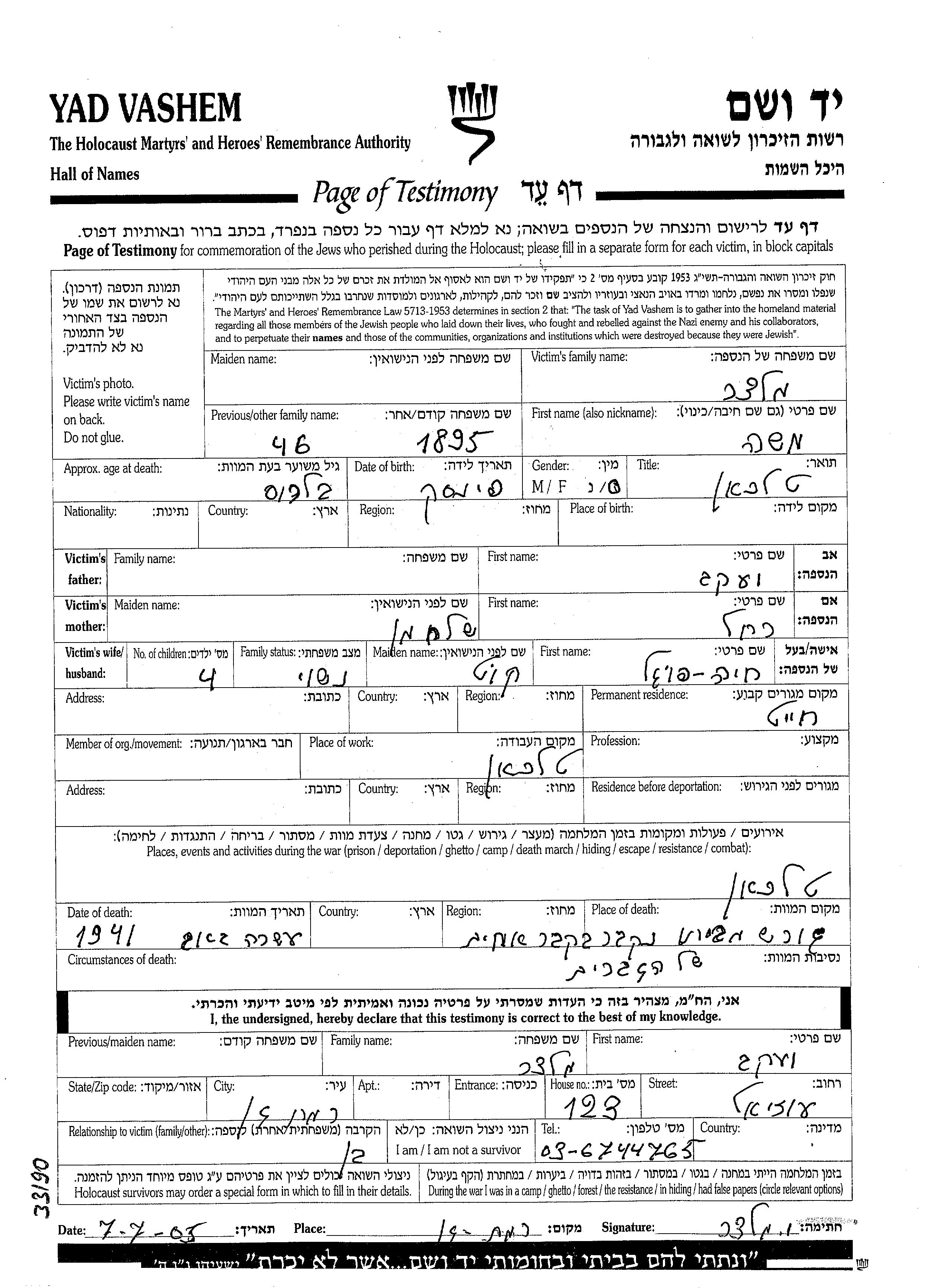 Moshe wurde in der Schoah ermordet. Todesort: Telchan, Polen im Jahr 03/08/1941.