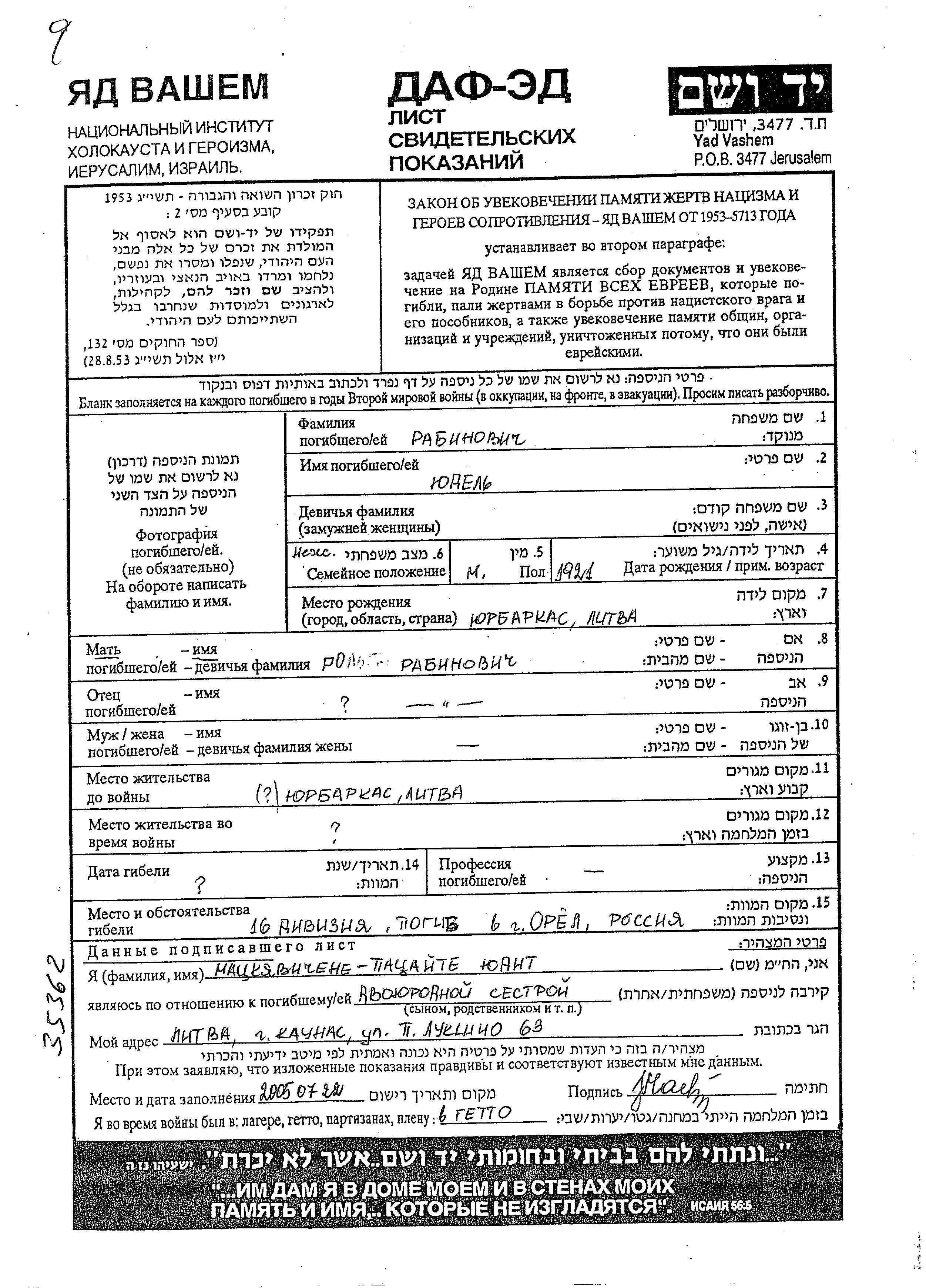Yudel Rabinovich wurde im Jahr 1921 in Jurbarkas, Litauen geboren. Er war Ledig. Vor dem Zweiten Weltkrieg lebte er in Jurbarkas, Litauen. Während des Krieges war er in die Sowjetischen Streitkräfte.