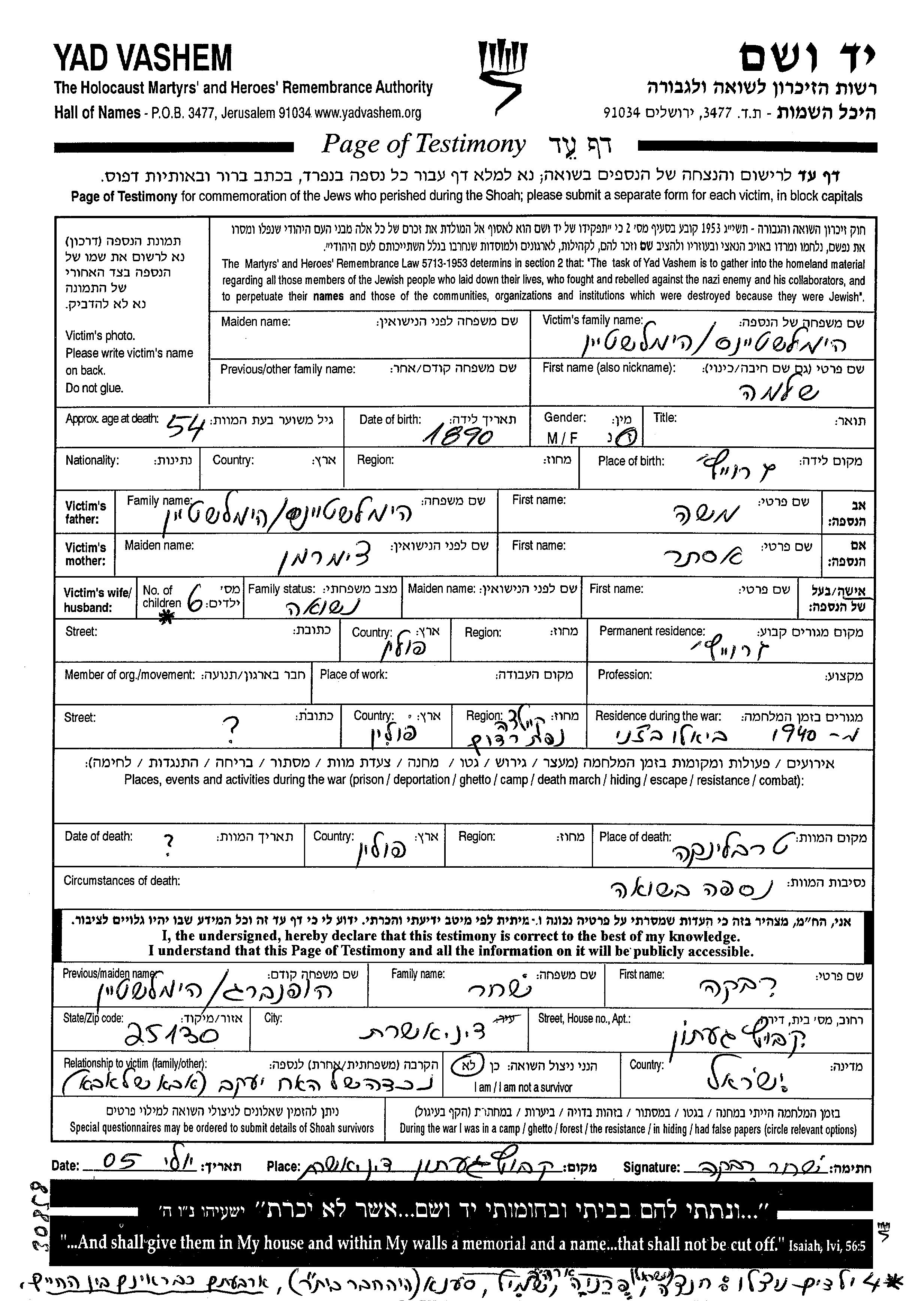 Shlomo Himelshteines wurde im Jahr 1890 in Grojec, Polen geboren. Er war der Sohn von Moshe und Ester, geb. Tzimerman. Er war Verheiratet. Vor dem Zweiten Weltkrieg lebte er in Grojec, Polen. Während des Krieges war er in Bialobrzegi, Polen.