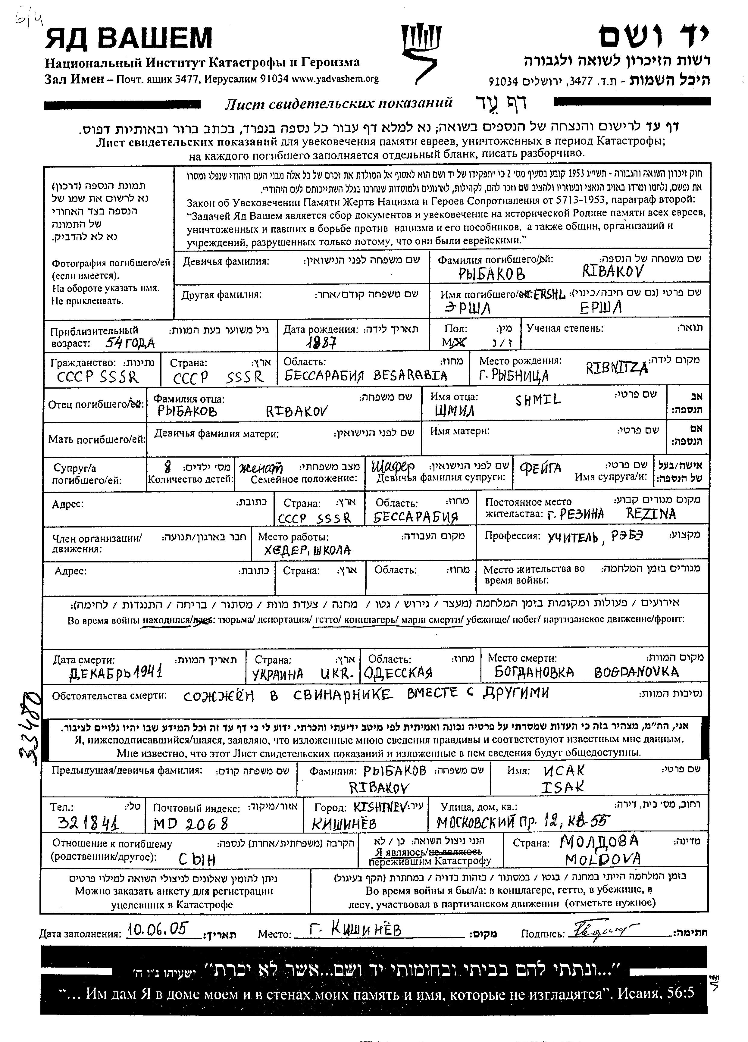 Yershl Ribakov wurde im Jahr 1887 in Rybnitsa, Ukraine (UdSSR) geboren. Er war der Sohn von Shmil. Er war Rabbiner und mit Feiga, geb. Shafer Verheiratet. Vor dem Zweiten Weltkrieg lebte er in Rezina, Rumänien.
