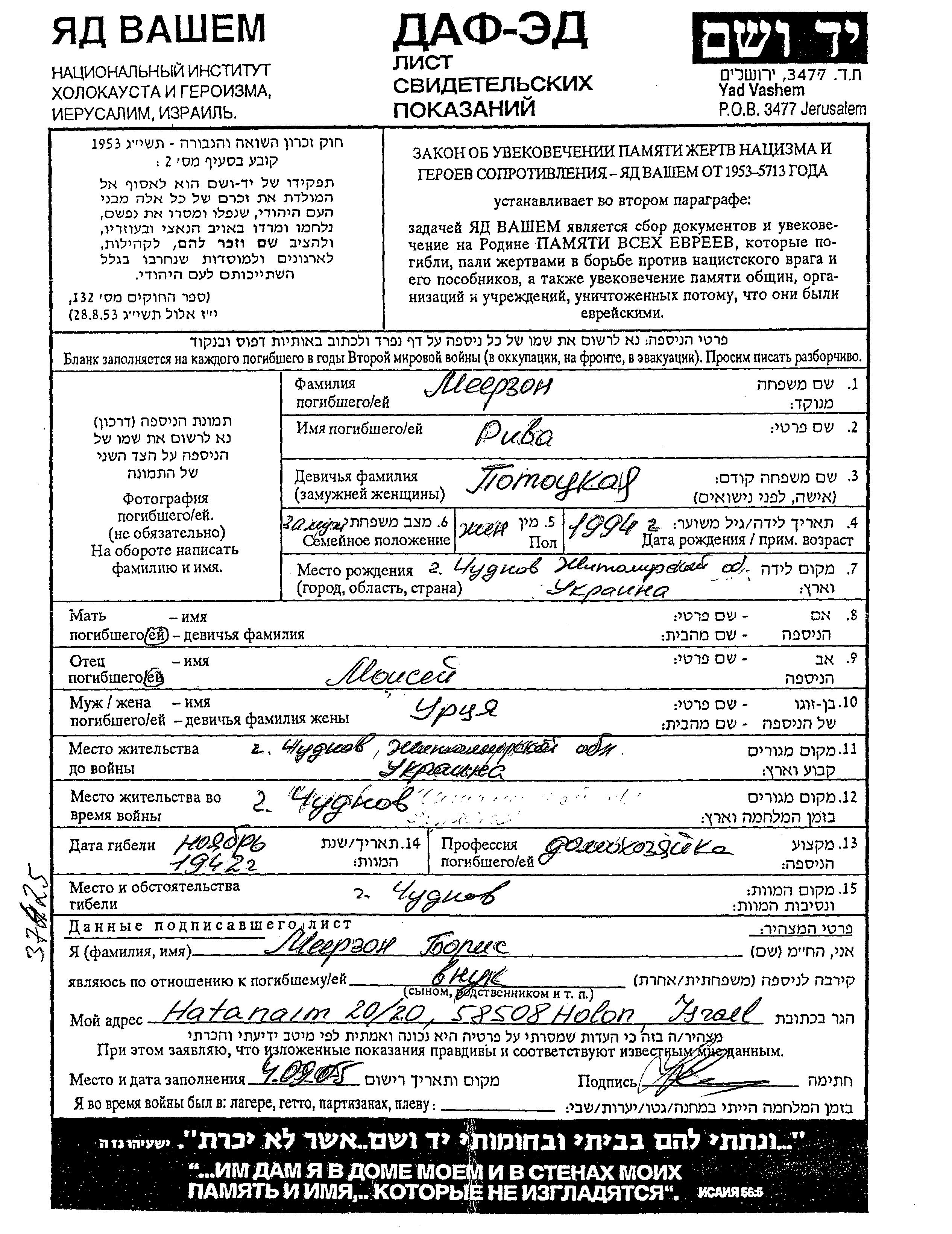 Riva Meerzon, geb. Pototzkaya wurde im Jahr 1894 in Chudnov, Ukraine (UdSSR) geboren. Sie war die Tochter von Moisei. Sie war Hausfrau und mit Urtzya Verheiratet. Vor dem Zweiten Weltkrieg lebte sie in Chudnov, Ukraine (UdSSR). Während des Krieges war sie in Chudnov, Ukraine (UdSSR).