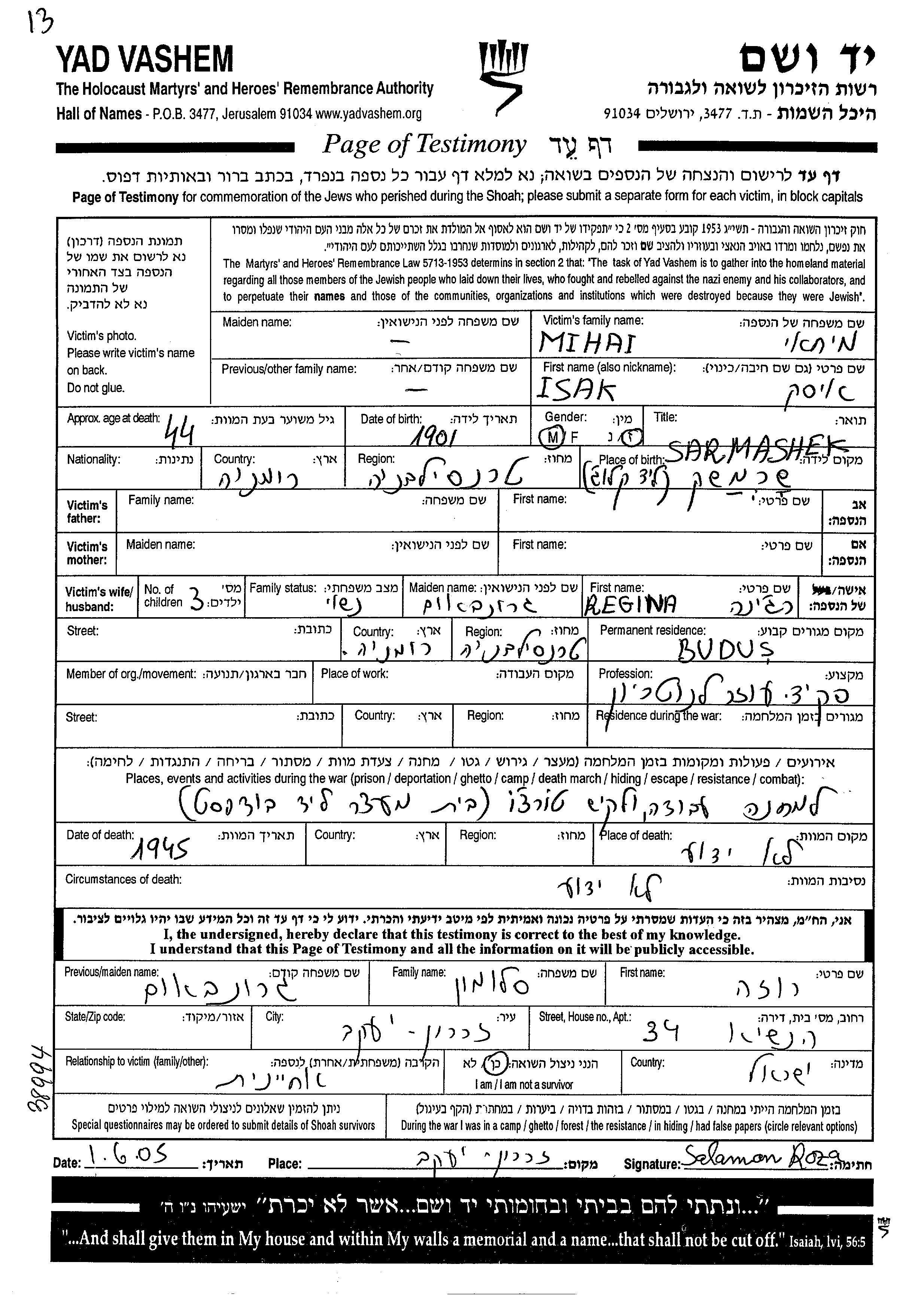 Isak Mihai wurde im Jahr 1901 in Sarmasak, Rumänien geboren. Er war Angestellte/-r und mit Regina, geb. Grunbaum Grinbaum Verheiratet. Vor dem Zweiten Weltkrieg lebte er in Budus, Rumänien. Während des Krieges war er in Lager.