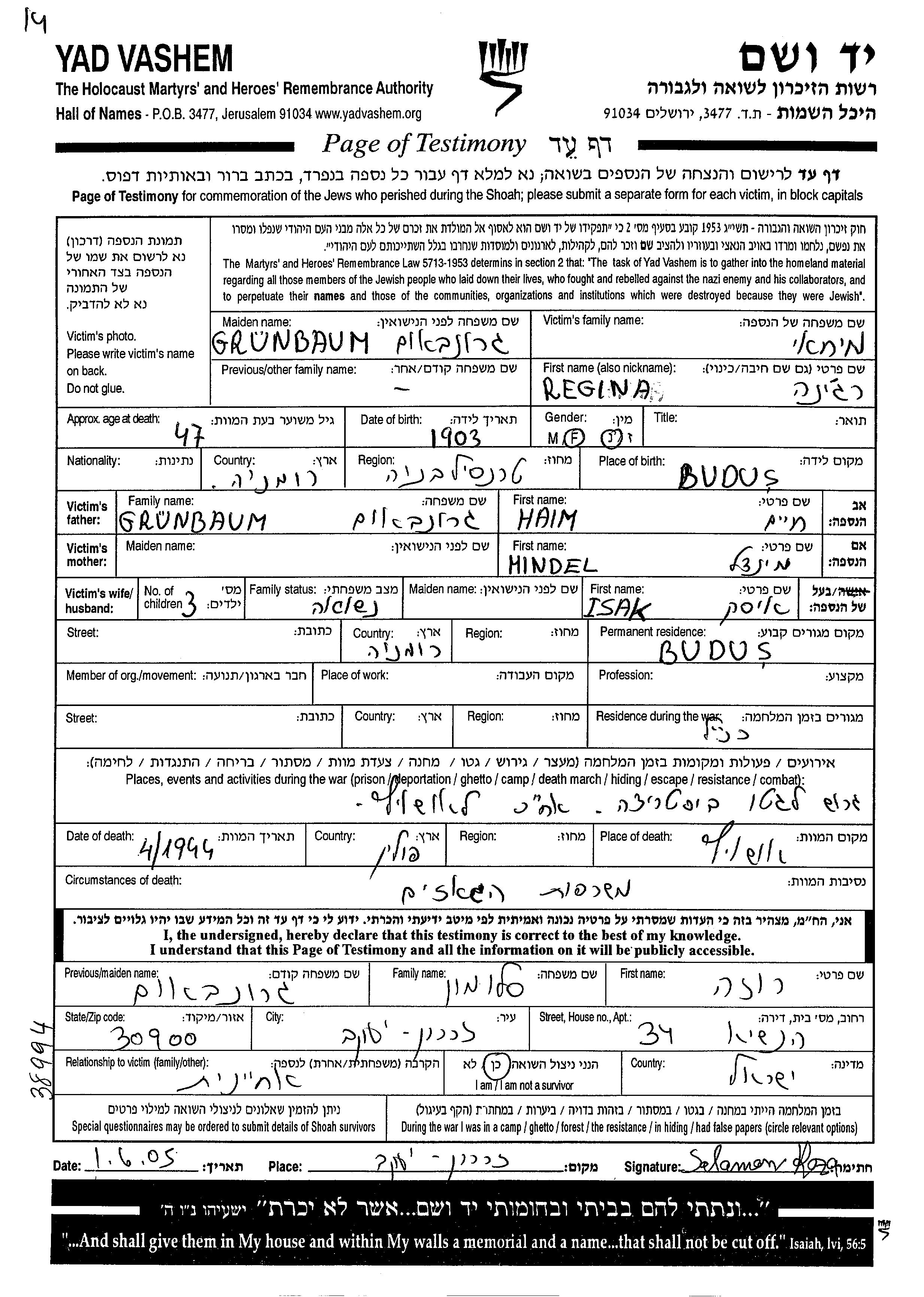 Regina מיחאי, geb. Grünbaum wurde im Jahr 1903 in Budus, Rumänien geboren. Sie war die Tochter von Haim und Mindel. Sie war mit Isak Verheiratet. Vor dem Zweiten Weltkrieg lebte sie in Budus, Rumänien. Während des Krieges war sie in Bistrita, Rumänien.