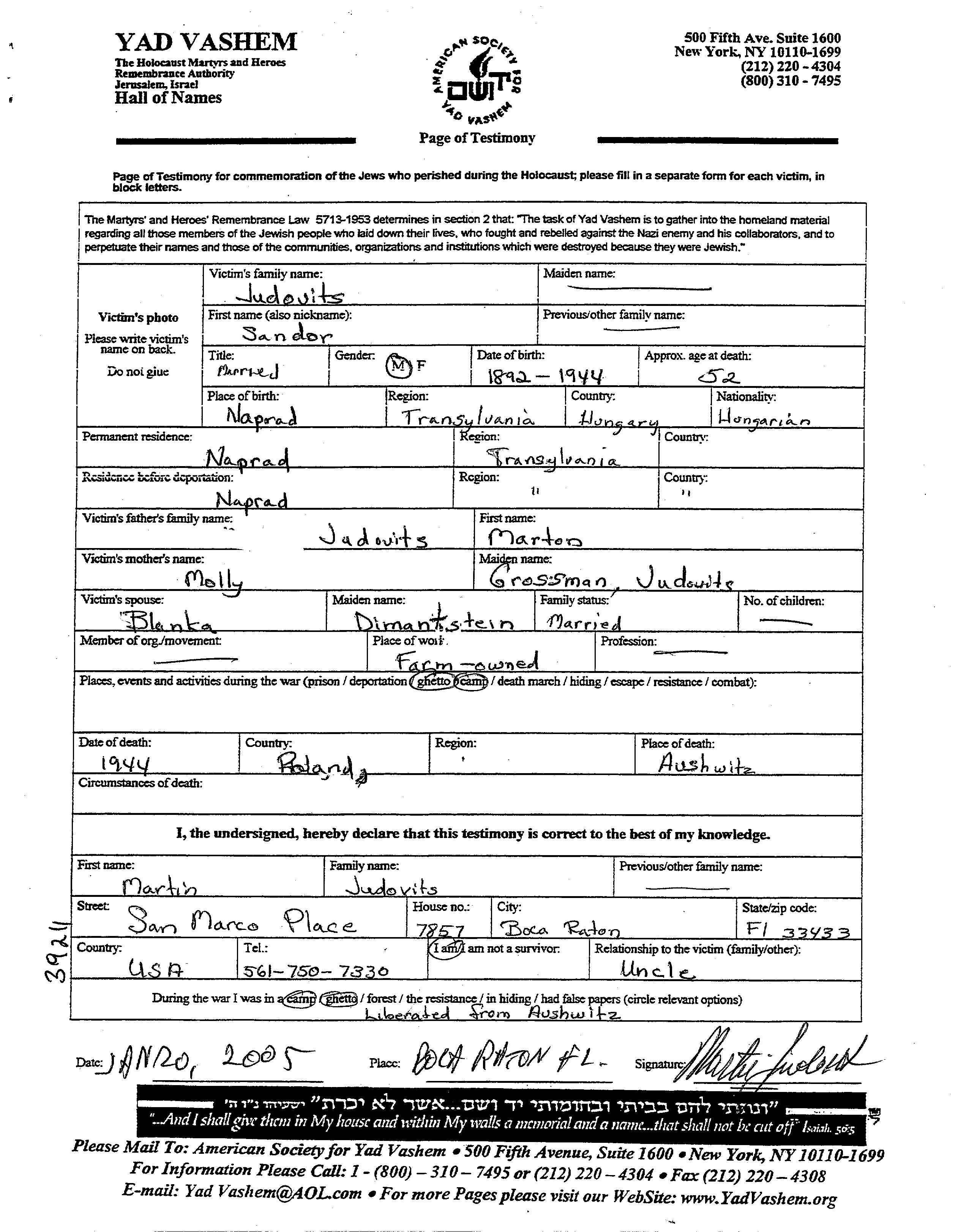Sandor Judovits wurde im Jahr 1892 in Naprad, Rumänien geboren. Er war der Sohn von Marton und Molly, geb. Grossman. Er war Hofbesitzer und mit Blanka, geb. Dimantstein Verheiratet. Vor dem Zweiten Weltkrieg lebte er in Naprad, Rumänien. Während des Krieges war er in Naprad, Rumänien.