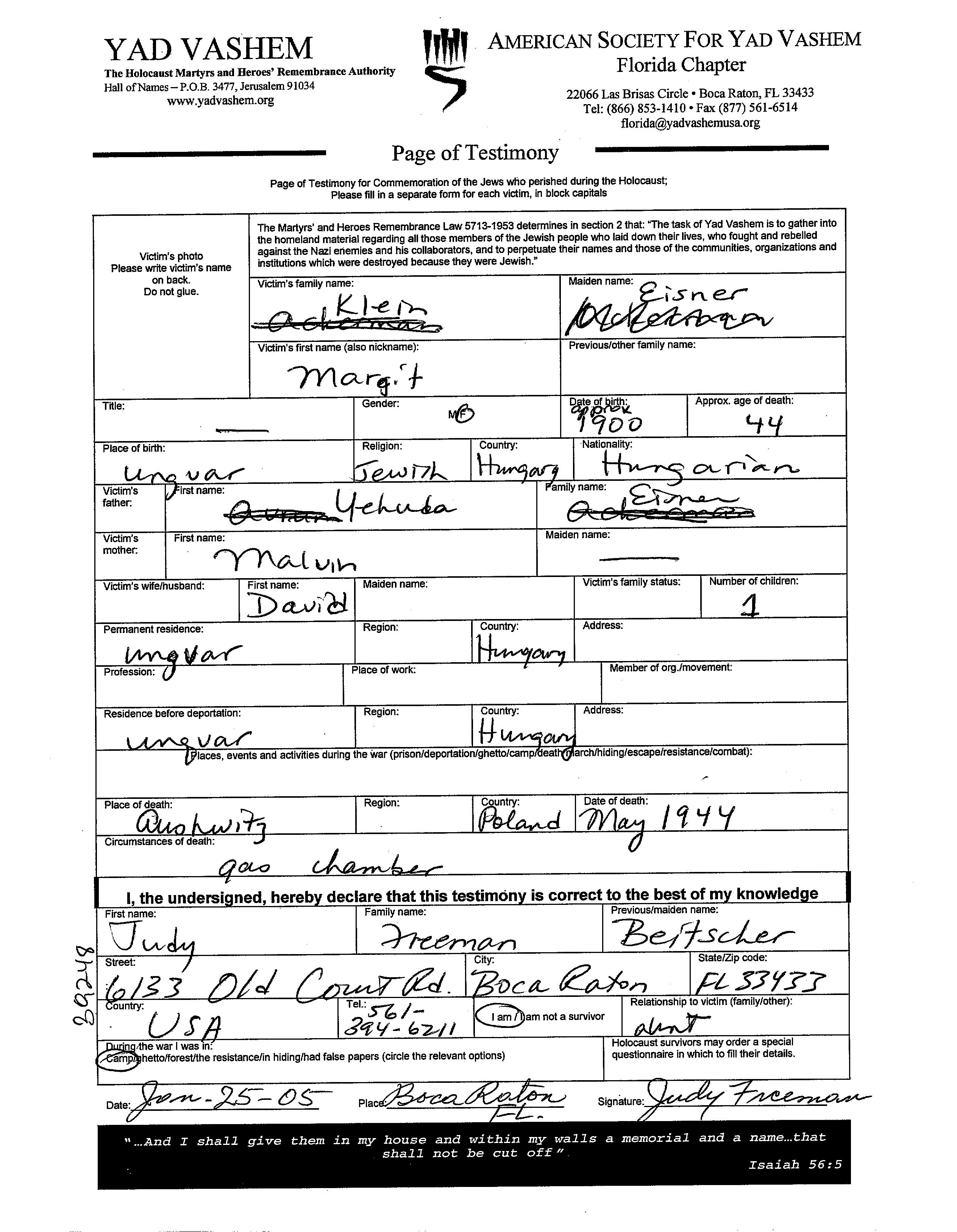 Margit Klein, geb. Eisner wurde im Jahr 1900 in Ungvar, Tschechoslowakei geboren. Sie war die Tochter von Yehuda und Malvin. Sie war mit David Verheiratet. Vor dem Zweiten Weltkrieg lebte sie in Ungvar, Tschechoslowakei. Während des Krieges war sie in Ungvar, Tschechoslowakei.