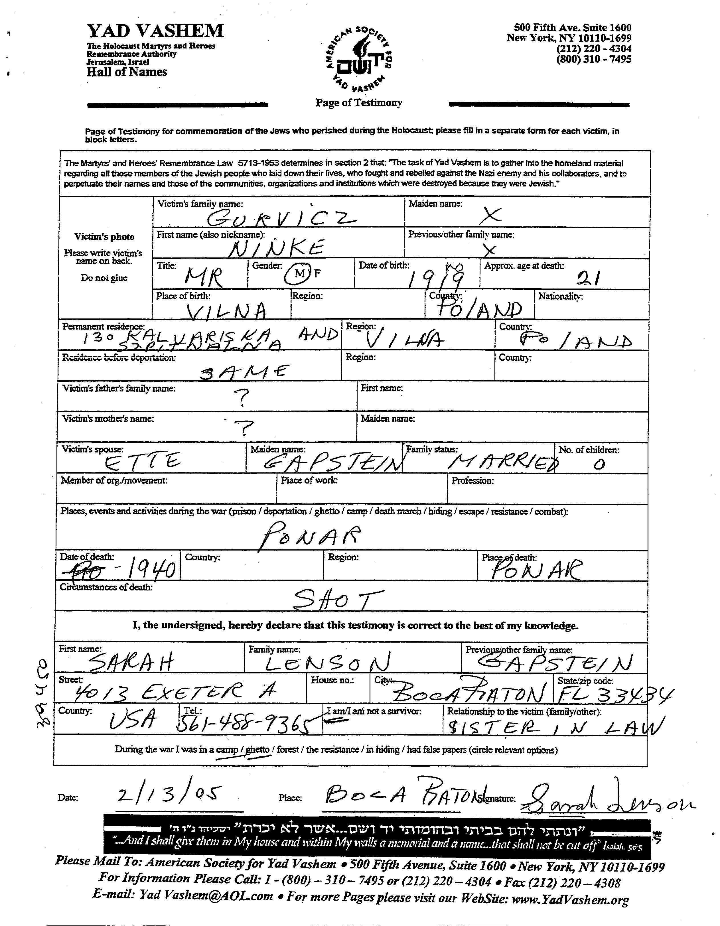 Ninke Gurvicz wurde im Jahr 1919 in Vilna, Polen geboren. Er war mit Ette, geb. Gapstein Verheiratet. Vor dem Zweiten Weltkrieg lebte er in Vilna, Polen. Während des Krieges war er in Wilno, Polen.