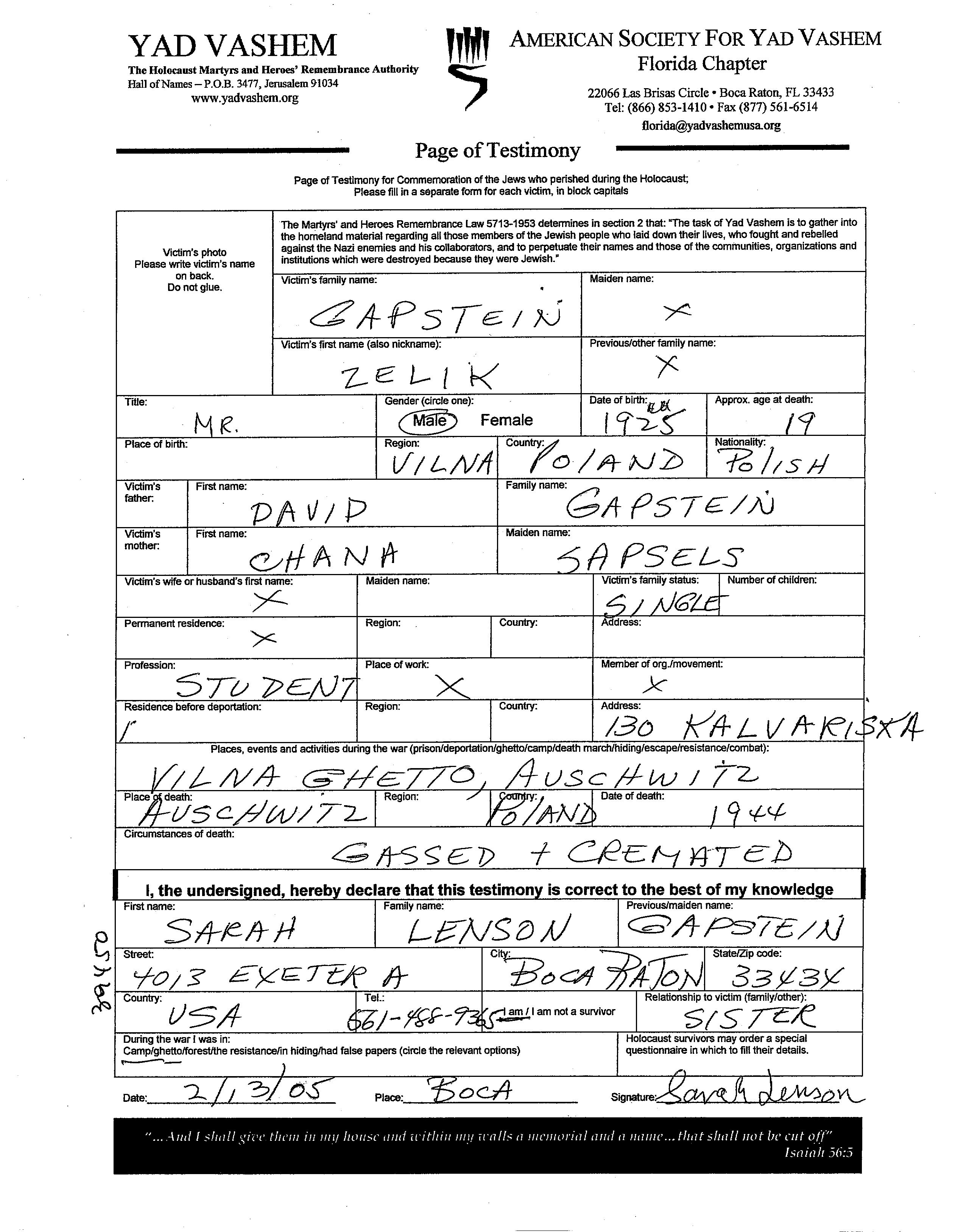 Zelik Gapstein wurde im Jahr 1925 in Vilna, Polen geboren. Er war der Sohn von David und Chana, geb. Sapsels. Er war Student und Ledig. Während des Krieges war er in Wilno, Polen.