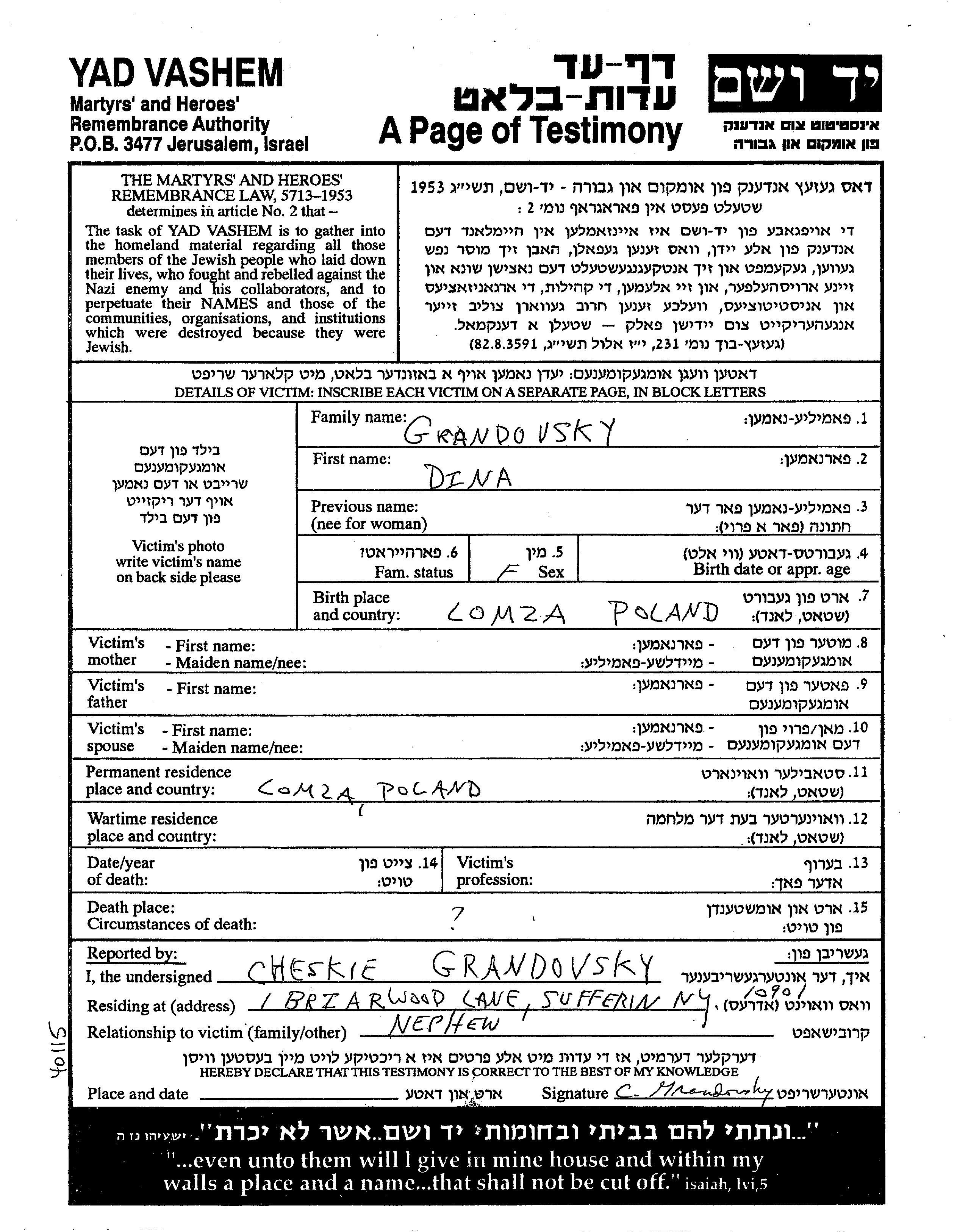 Grandovsky Dina Łomża, Polen Gedenkblatt