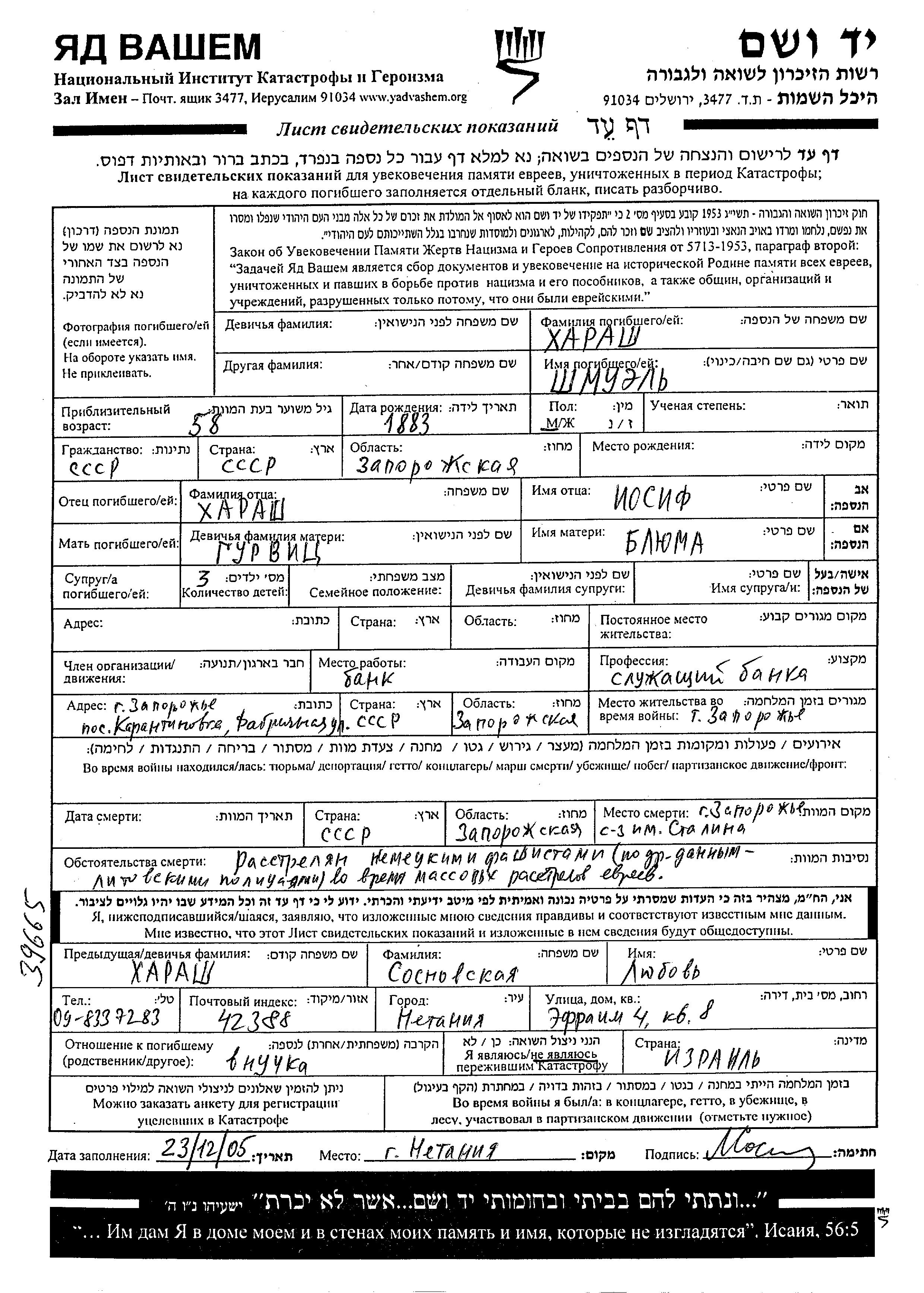 Shmuel Kharash wurde im Jahr 1883 in Zaporozhye, Ukraine (UdSSR) geboren. Er war der Sohn von Iosif und Blyuma, geb. Gurvitz. Er war Bankangestellte/-r. Vor dem Zweiten Weltkrieg lebte er in Zaporozhye, Ukraine (UdSSR). Während des Krieges war er in Zaporozhye, Ukraine (UdSSR).