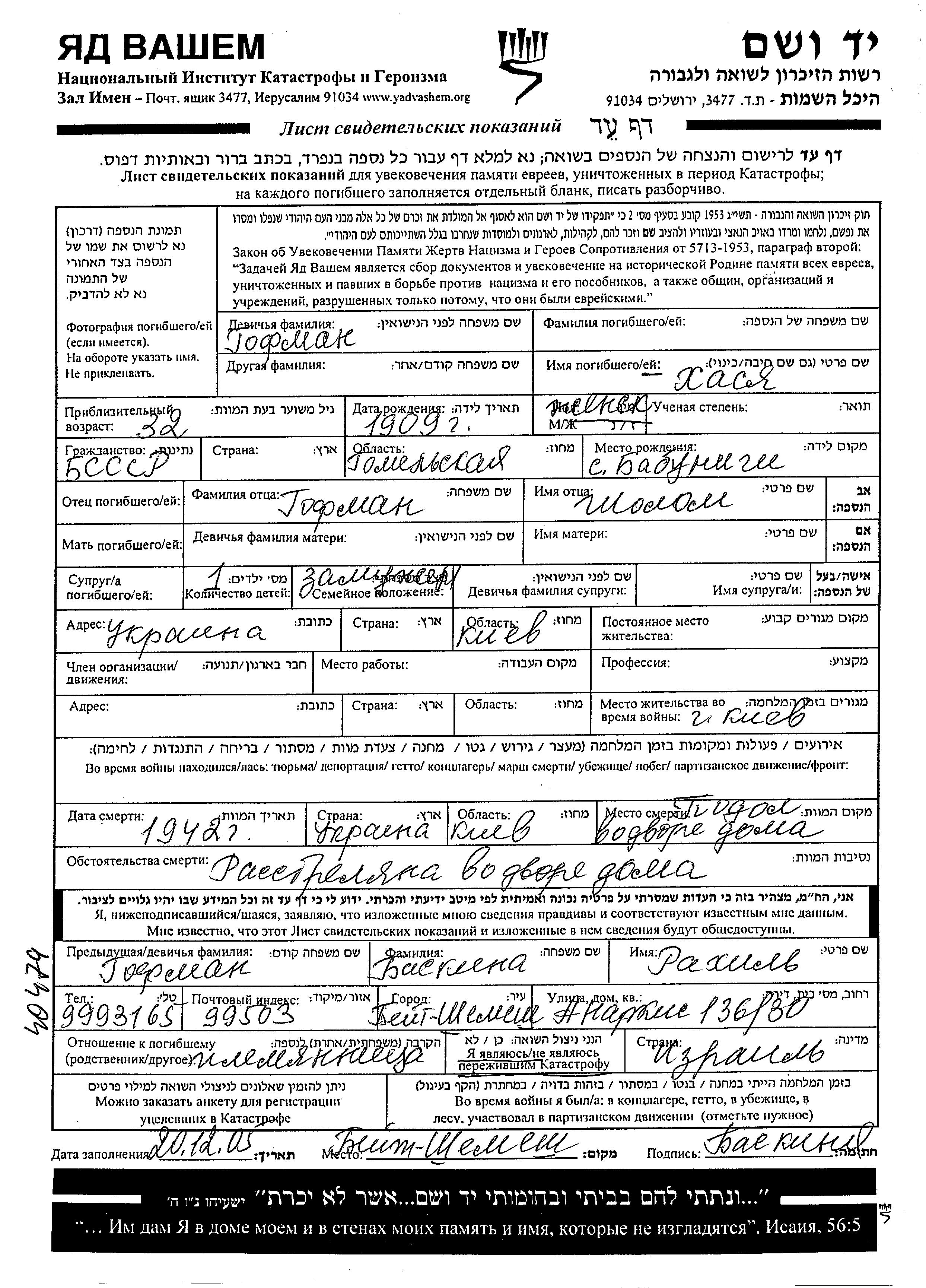 Khasya wurde in der Schoah ermordet. Todesort: Kiev, Ukraine (UdSSR) im Jahr 1942.