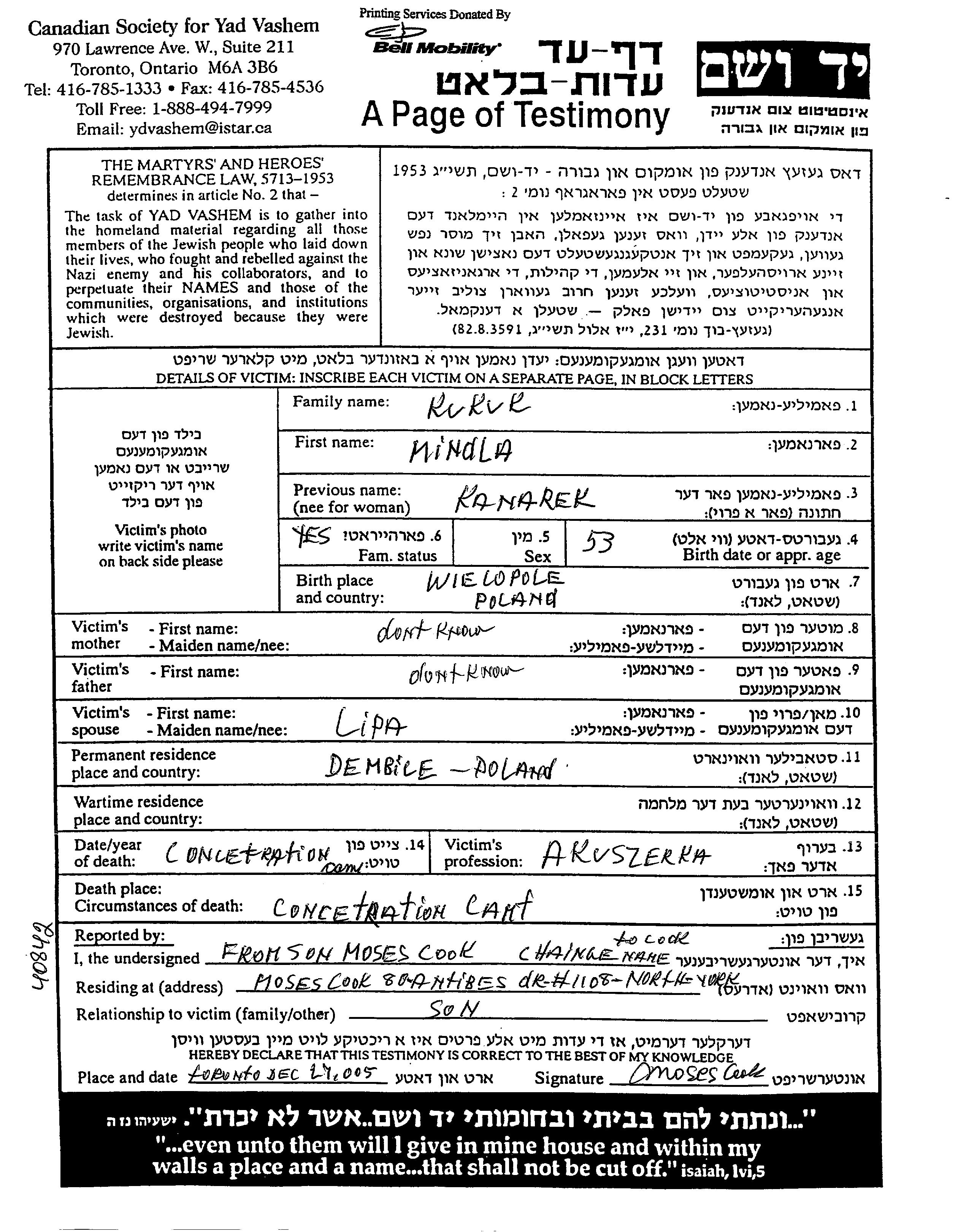 Mindla Kukuk, geb. Kanarek wurde in Wielopole, Polen geboren. Sie war Hebamme und mit Lipa Verheiratet. Vor dem Zweiten Weltkrieg lebte sie in Debice, Polen.