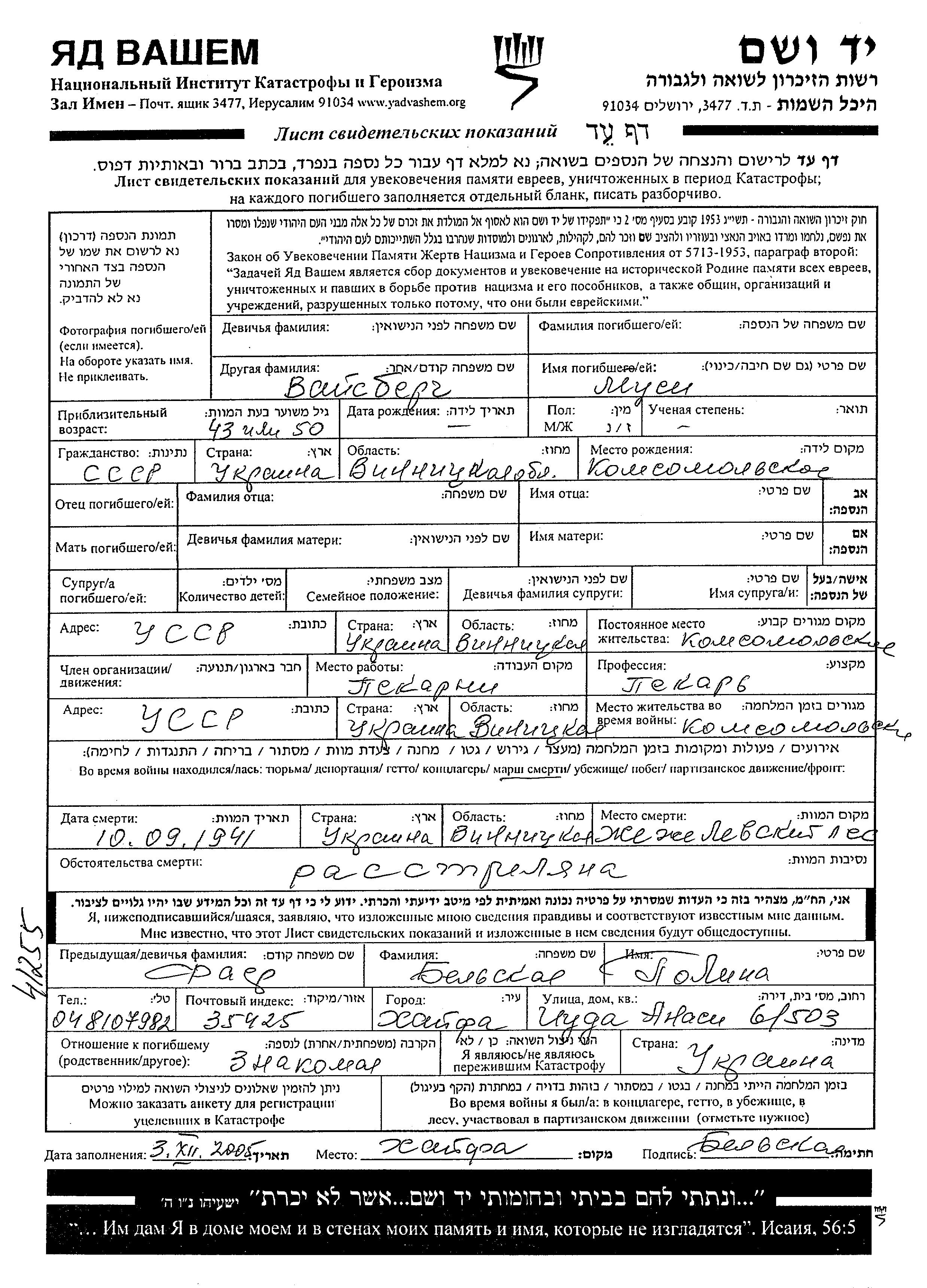 Musi wurde in der Schoah ermordet. Todesort: Vinnitsa, Ukraine (UdSSR) im Jahr 10/09/1941.