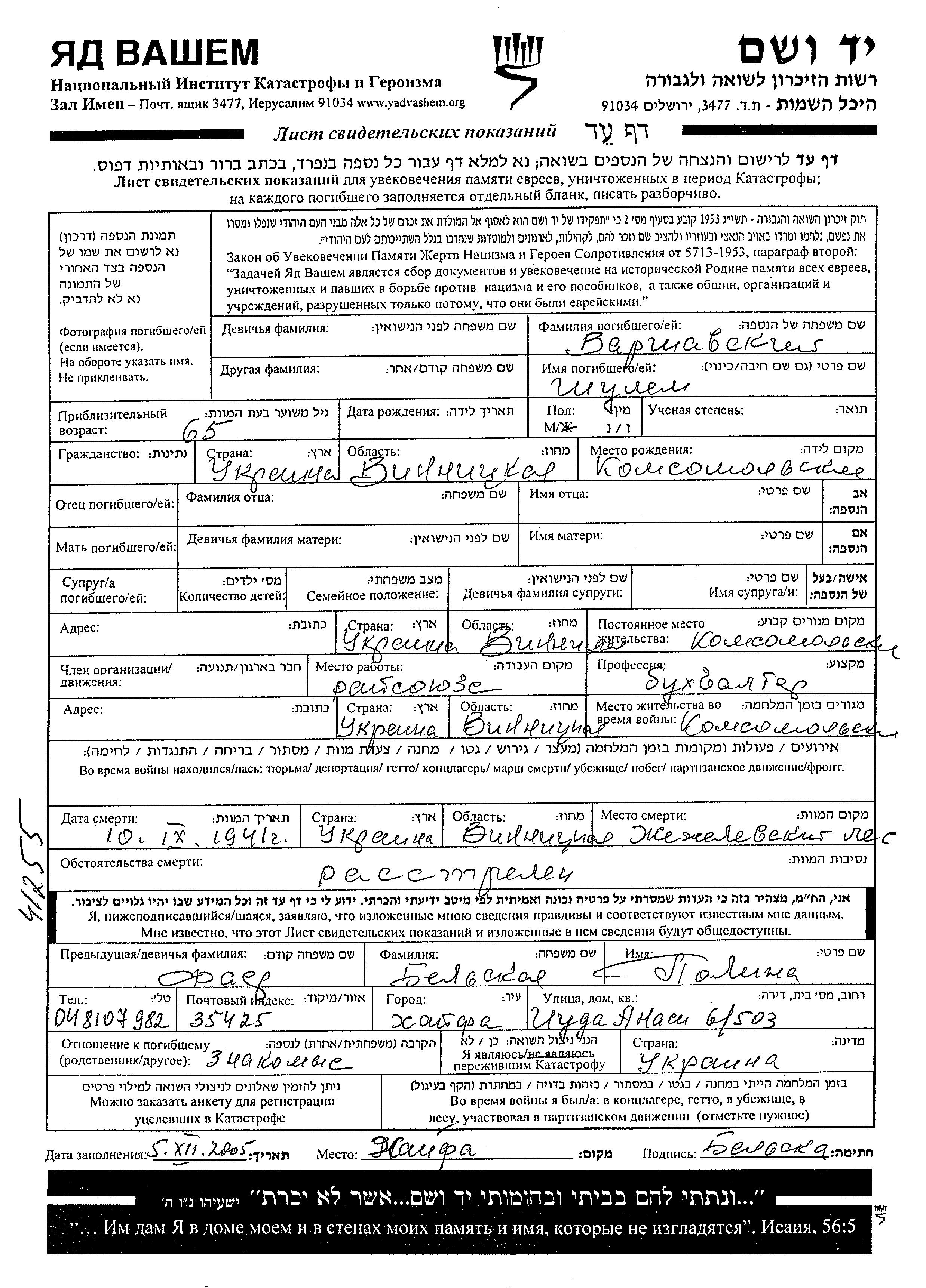 Shulem wurde in der Schoah ermordet. Todesort: Vinnitsa, Ukraine (UdSSR) im Jahr 10/09/1941.