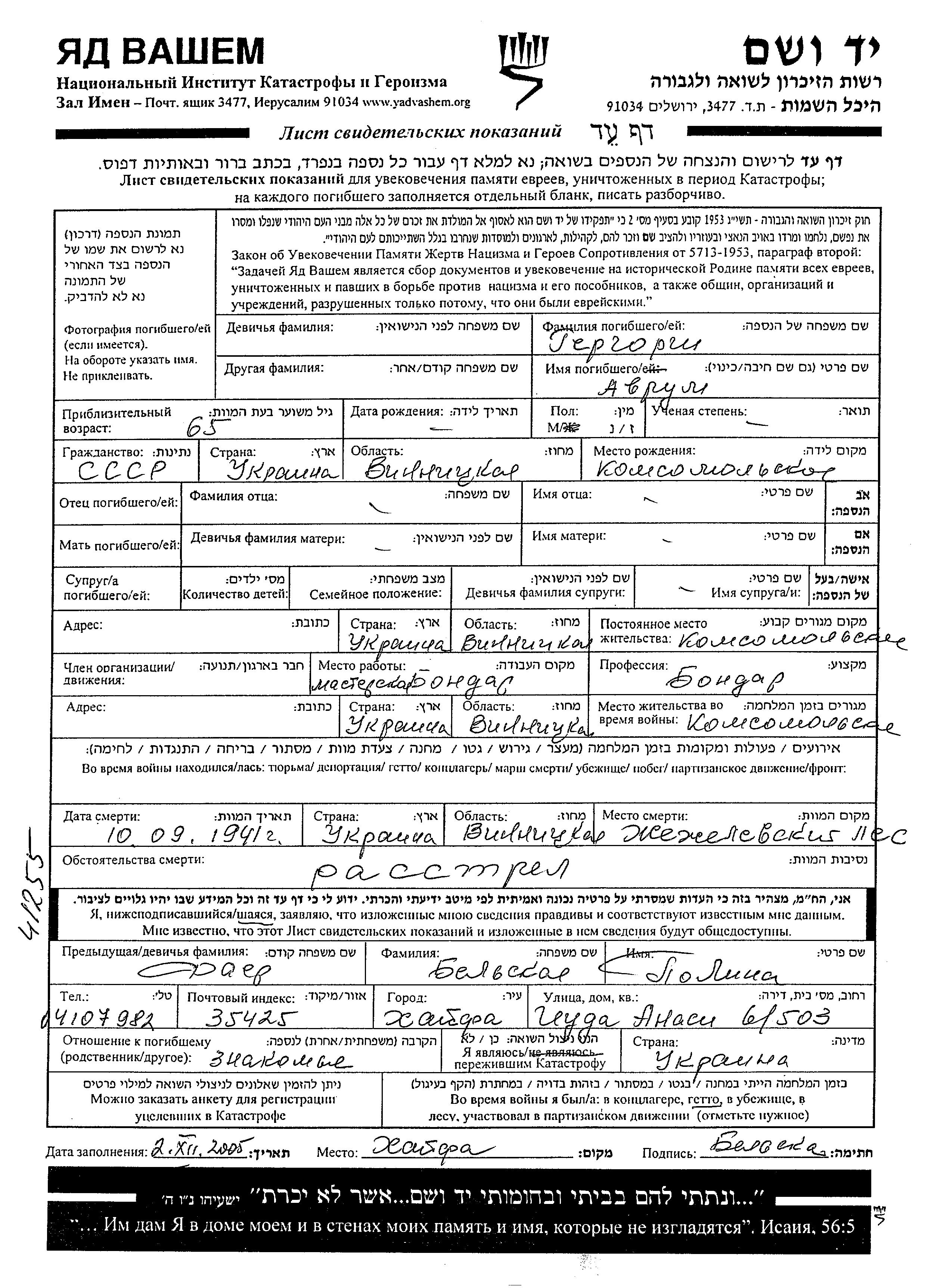 Avrum wurde in der Schoah ermordet. Todesort: Vinnitsa, Ukraine (UdSSR) im Jahr 10/09/1941.