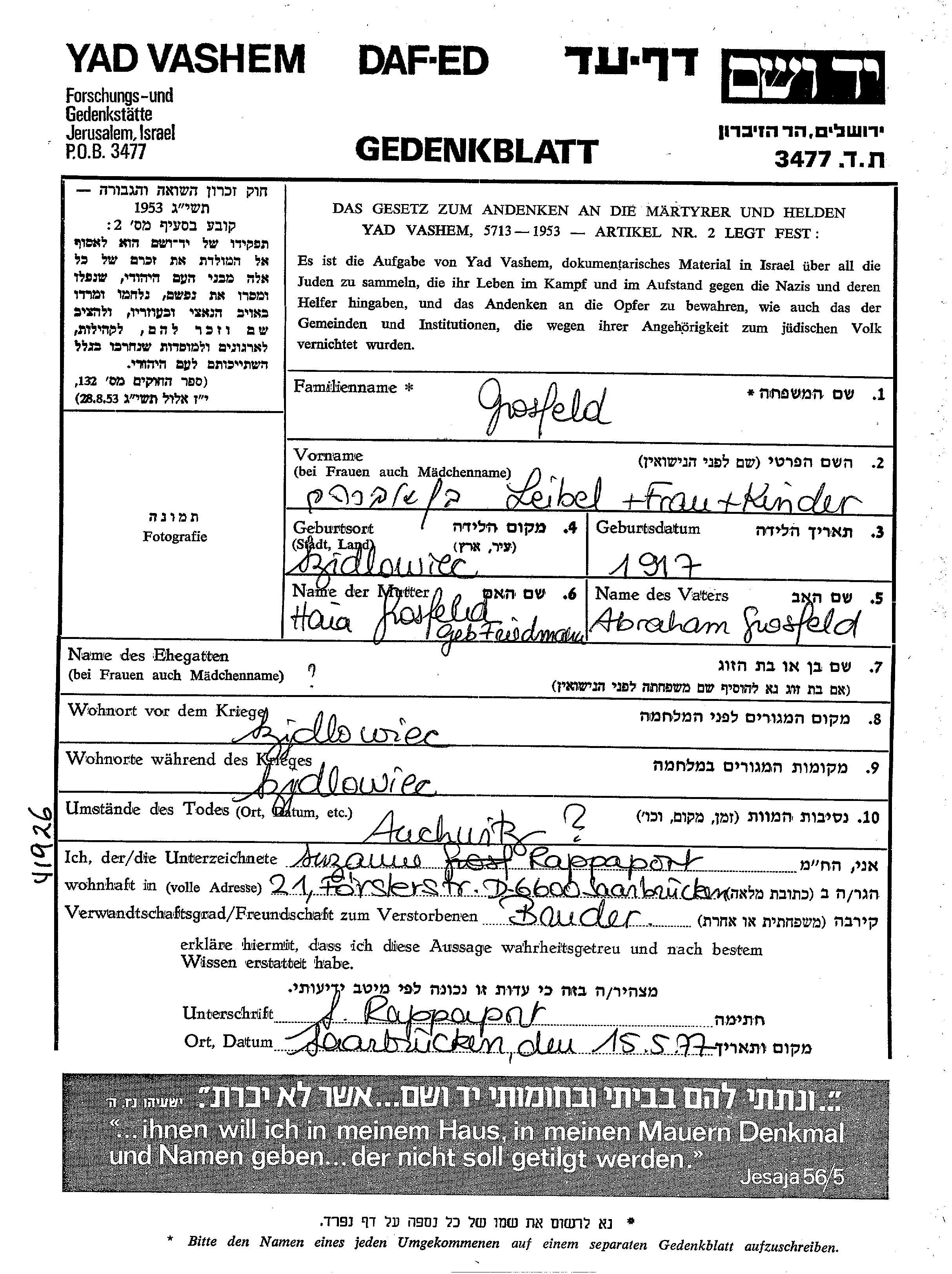Leibel Grosfeld wurde im Jahr 1917 in Szydlowiec, Polen geboren. Er war der Sohn von Abraham und Haia, geb. Friedman. Er war Verheiratet. Vor dem Zweiten Weltkrieg lebte er in Szidlowiec, Polen. Während des Krieges war er in Szidlowiec, Polen.