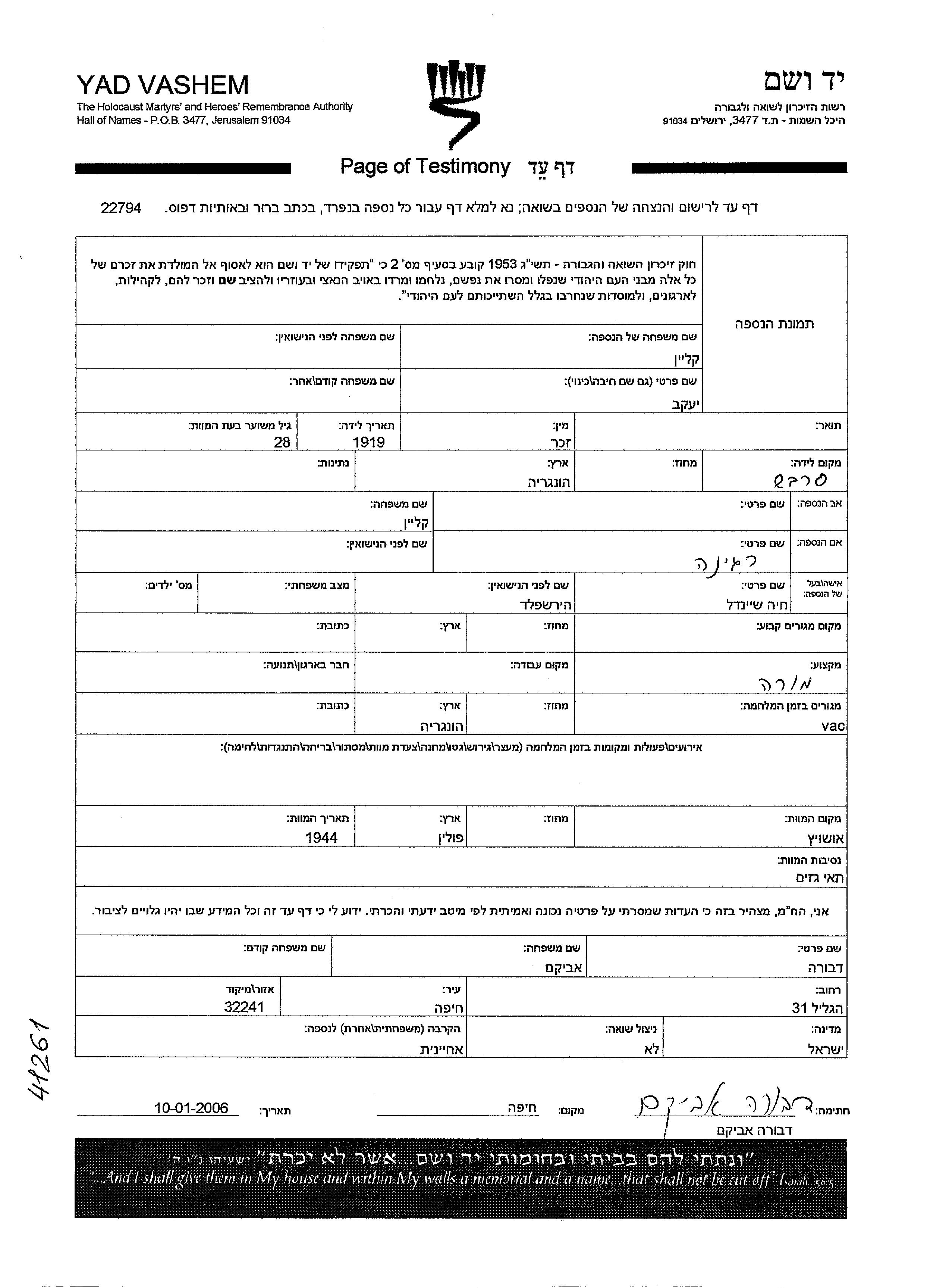 Yaakov Klein wurde im Jahr 1919 in Szarvas, Ungarn geboren. Er war der Sohn von Regina. Er war Lehrer/in und mit Chaia Sheindl, geb. Hirshfeld Verheiratet. Während des Krieges war er in Vac, Ungarn.