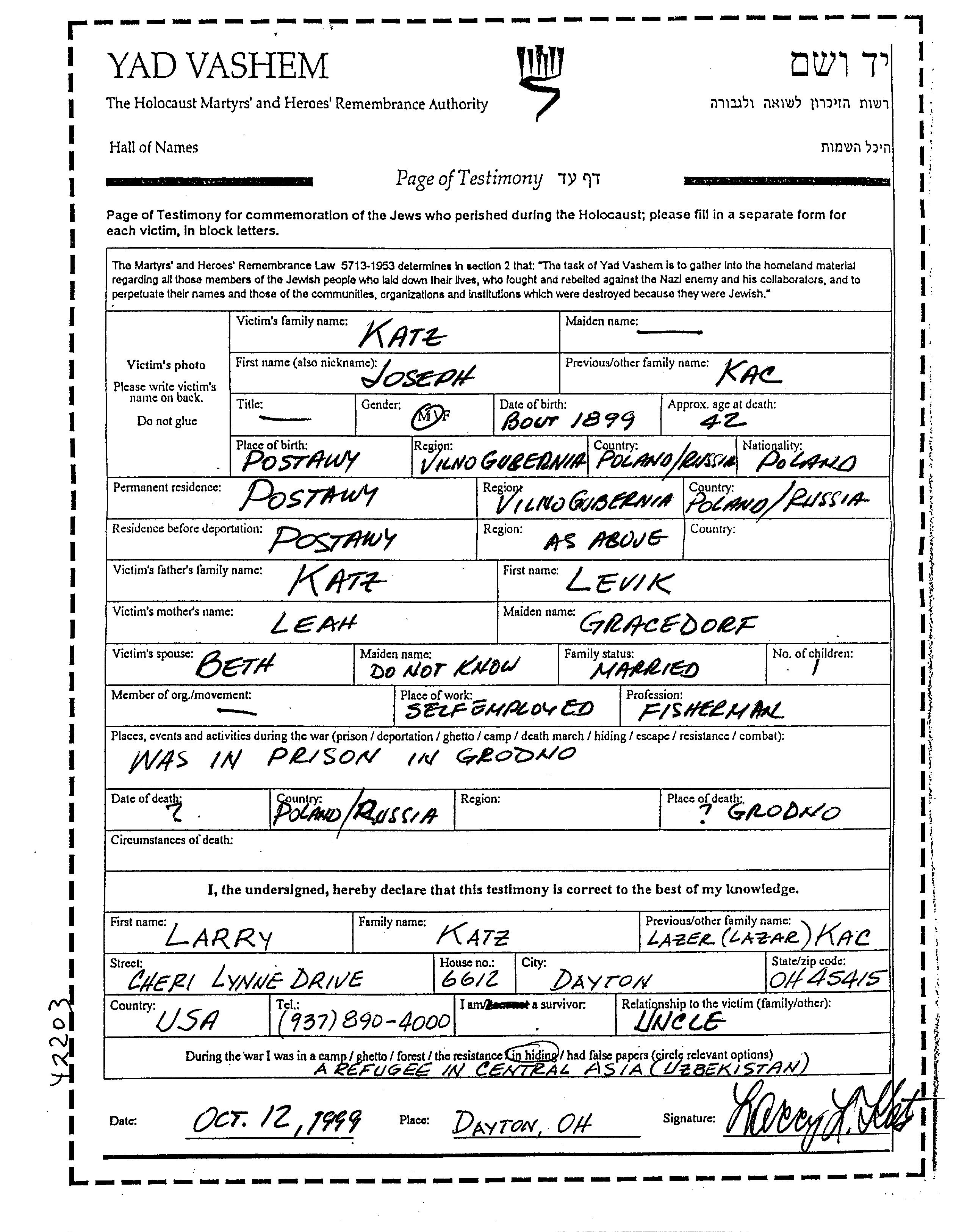 Joseph Katz wurde im Jahr 1899 in Postawy, Polen geboren. Er war der Sohn von Levik und Leah, geb. Gracedorf. Er war Fischer und mit Beth Verheiratet. Vor dem Zweiten Weltkrieg lebte er in Postawy, Polen. Während des Krieges war er in Postawy, Polen.