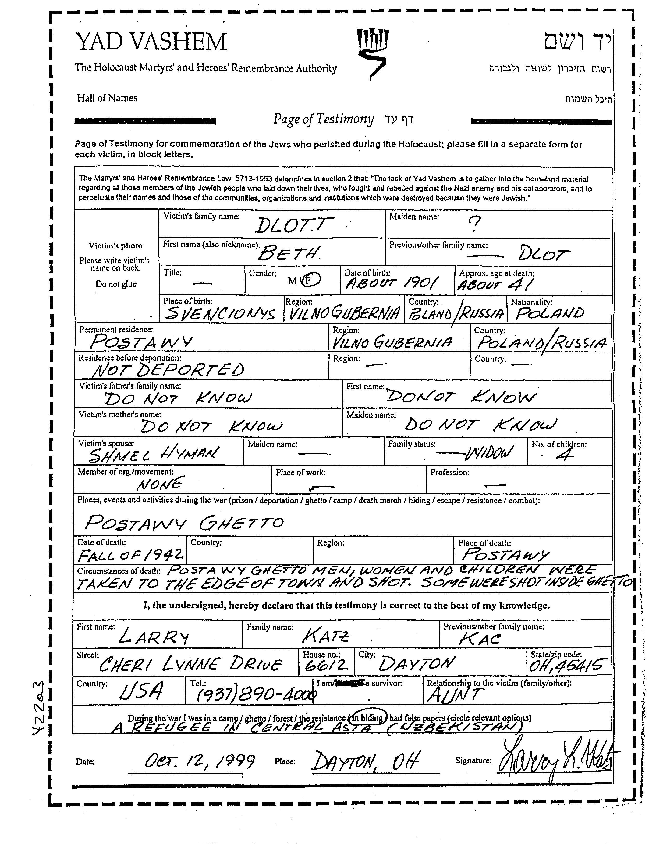 Beth Dlott wurde im Jahr 1901 in Svencionys, Polen geboren. Sie war mit Shmel Hyman Witwe. Vor dem Zweiten Weltkrieg lebte sie in Postawy, Polen. Während des Krieges war sie in Postawy, Polen.