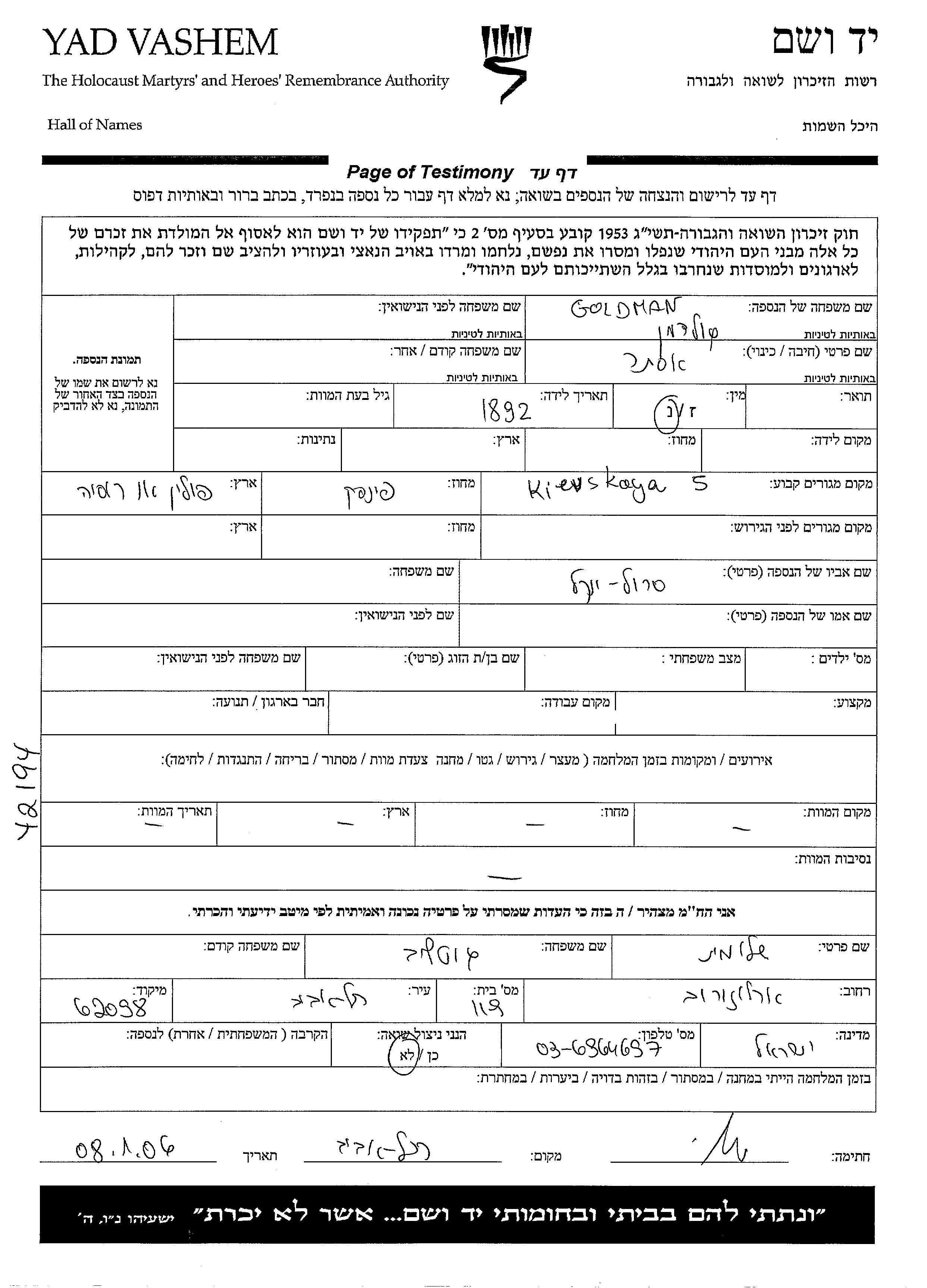 Ester Goldman wurde im Jahr 1892 geboren. Sie war die Tochter von Iankel Srul. Vor dem Zweiten Weltkrieg lebte sie in Pinsk, Polen.