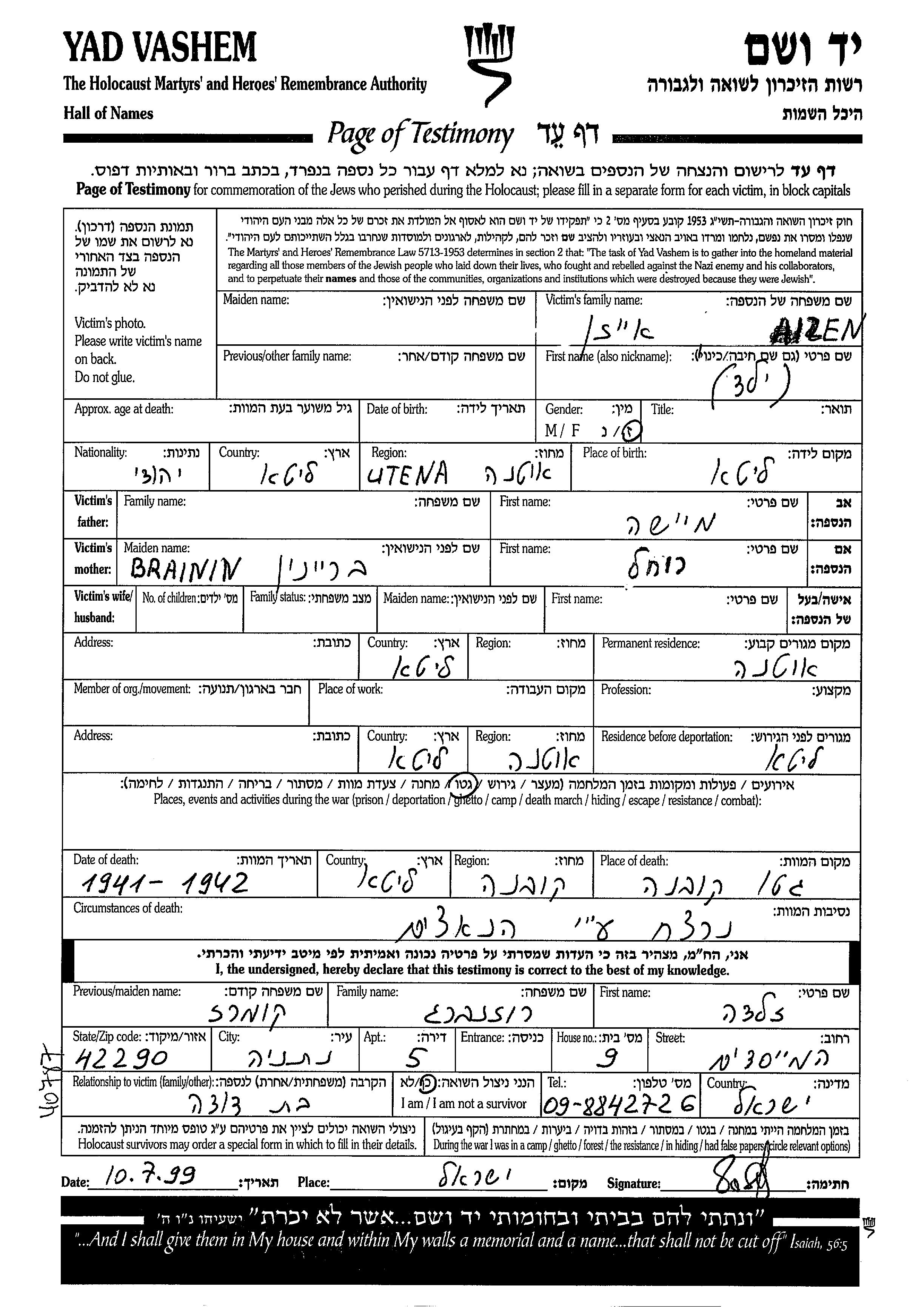 Aizen Vorname unbekannt Utena, Litauen Gedenkblatt