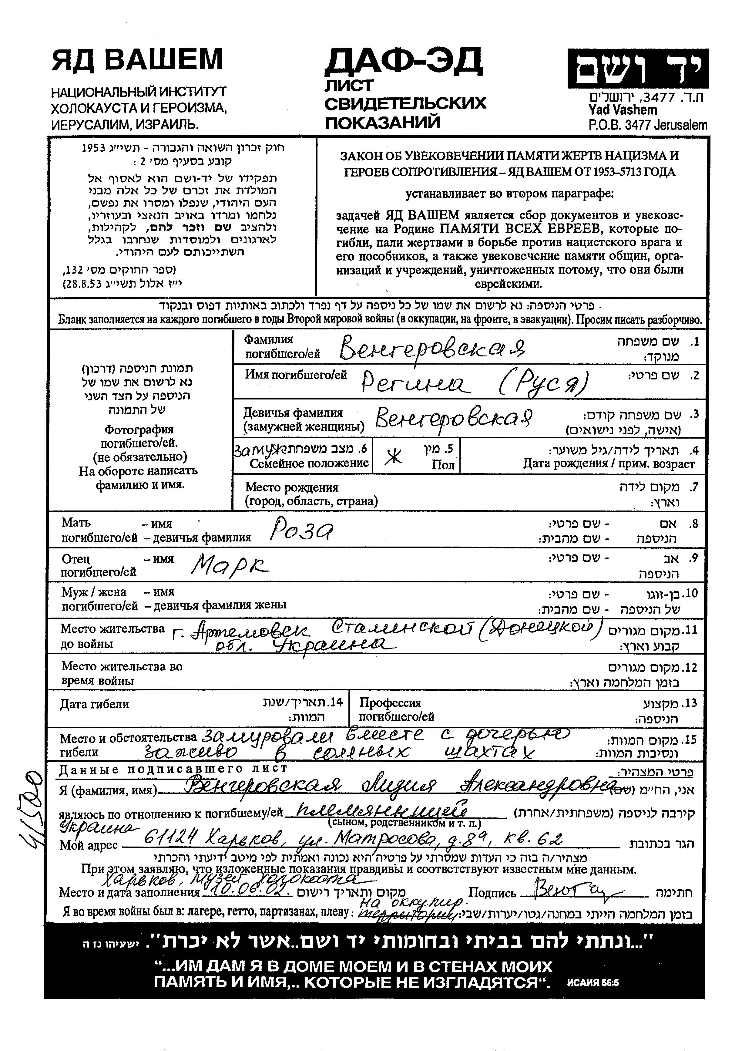 Regina Rusya Vengerovskaya, geb. Vengerovskaya wurde Sie war die Tochter von Mark und Roza. Sie war Verheiratet. Vor dem Zweiten Weltkrieg lebte sie in Artemovsk, Ukraine (UdSSR). Während des Krieges war sie in Artemovsk, Ukraine (UdSSR).