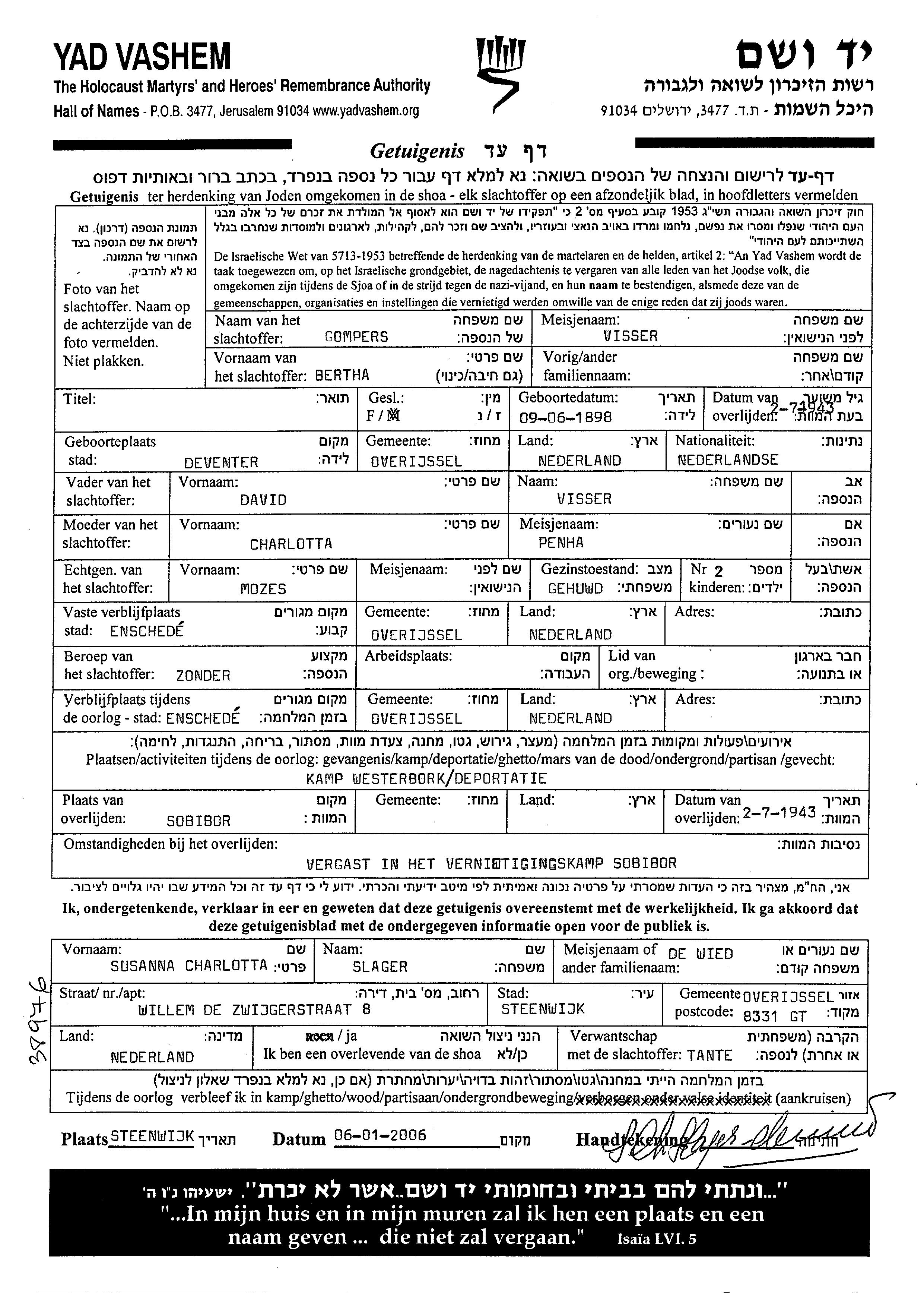 Bertha wurde in der Schoah ermordet. Todesort: Sobibor, Polen im Jahr 02/07/1943.