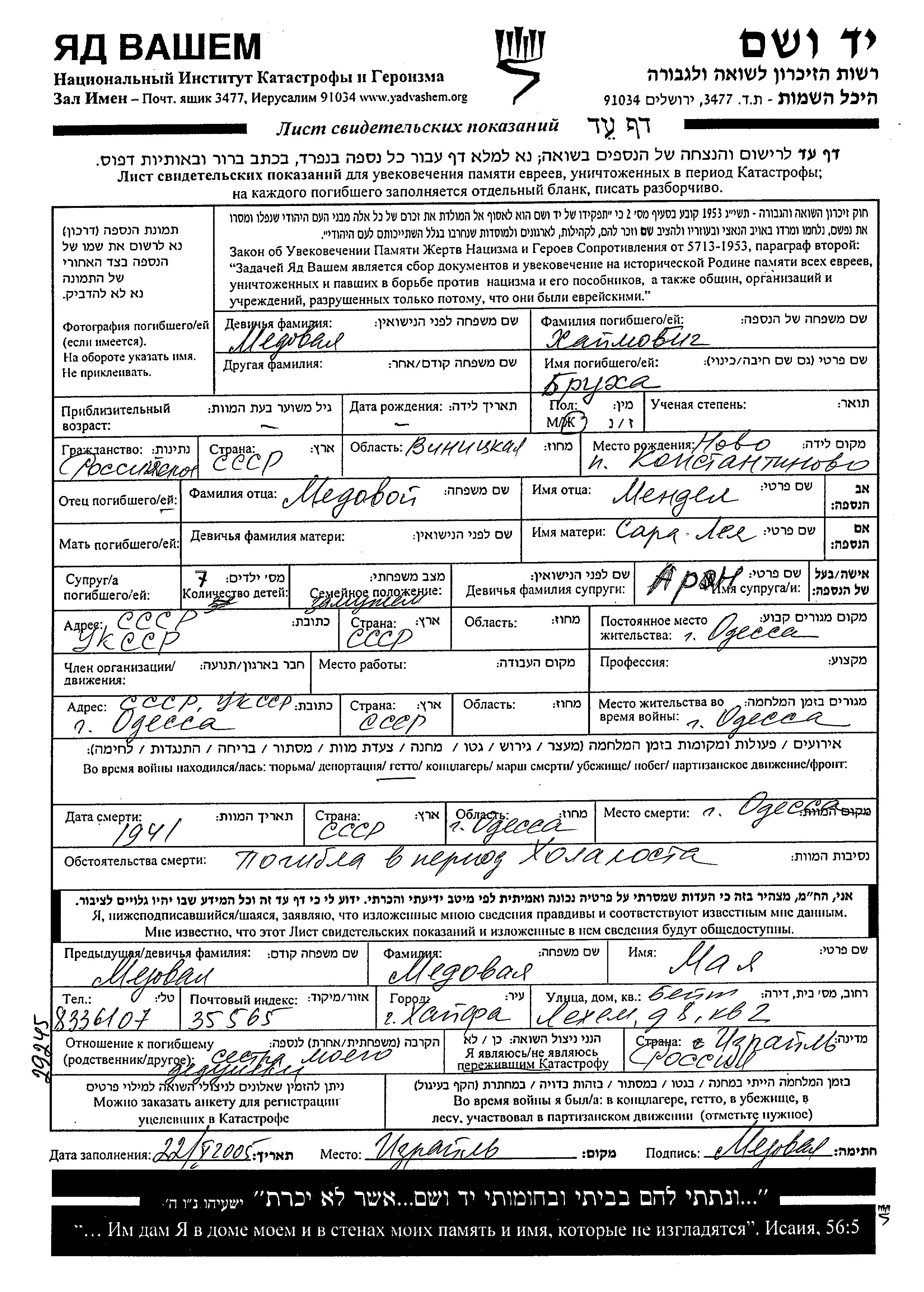 Brukha Khaimovich, geb. Medovaya wurde in Novo Konstantinov, Ukraine (UdSSR) geboren. Sie war die Tochter von Mendel und Sara Leya. Sie war mit Aron Verheiratet. Vor dem Zweiten Weltkrieg lebte sie in Odessa, Ukraine (UdSSR). Während des Krieges war sie in Odessa, Ukraine (UdSSR).