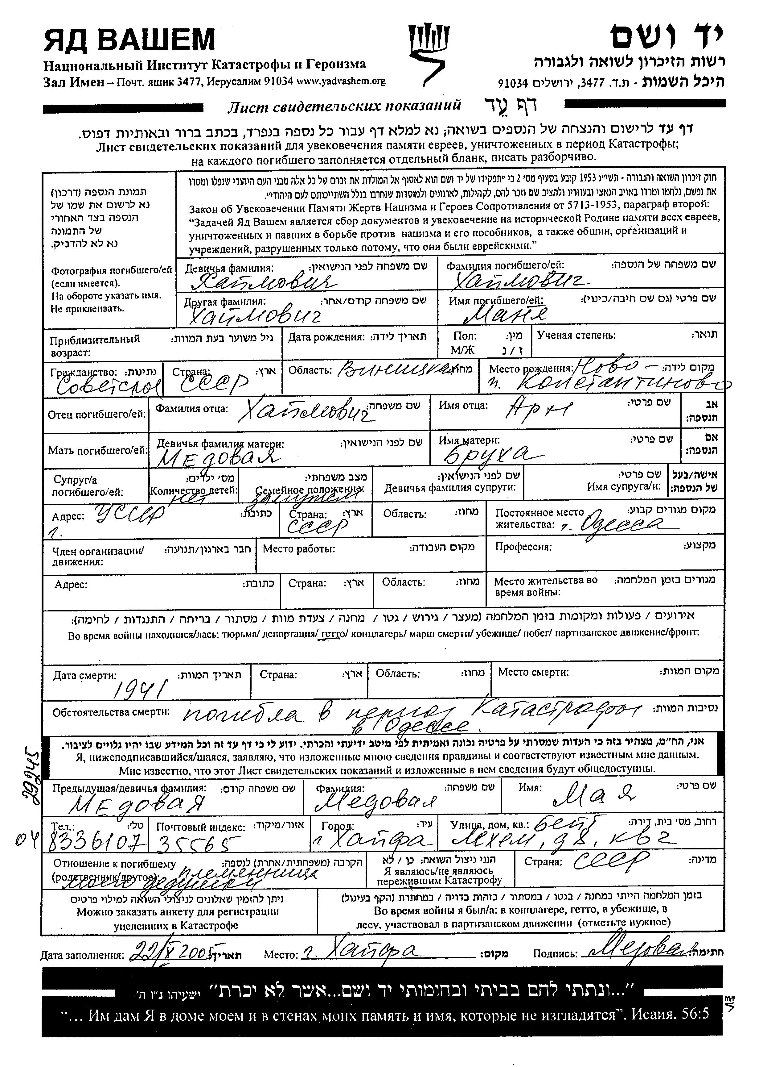 Manya Name unbekannt wurde in Novokonstantinov, Ukraine (UdSSR) geboren. Sie war die Tochter von Arn und Brukha, geb. Medovaya. Sie war Verheiratet. Vor dem Zweiten Weltkrieg lebte sie in Odessa, Ukraine (UdSSR). Während des Krieges war sie in Odessa, Ukraine (UdSSR).