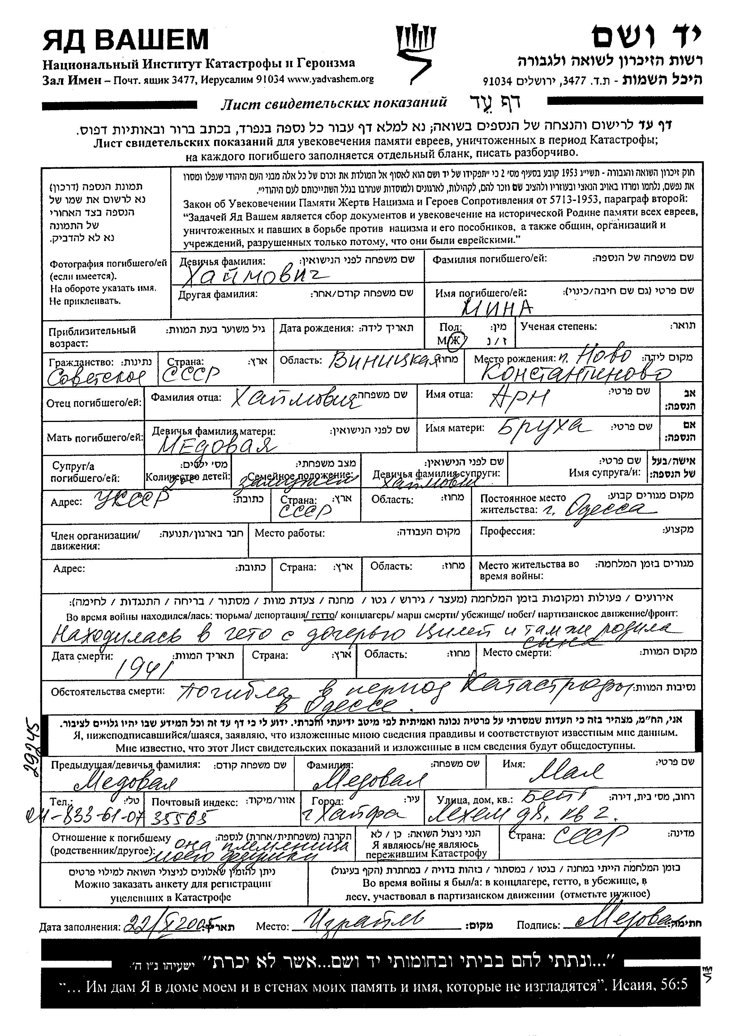 Mina wurde in der Schoah ermordet. Todesort: Odessa, Ukraine (UdSSR) im Jahr 1941.