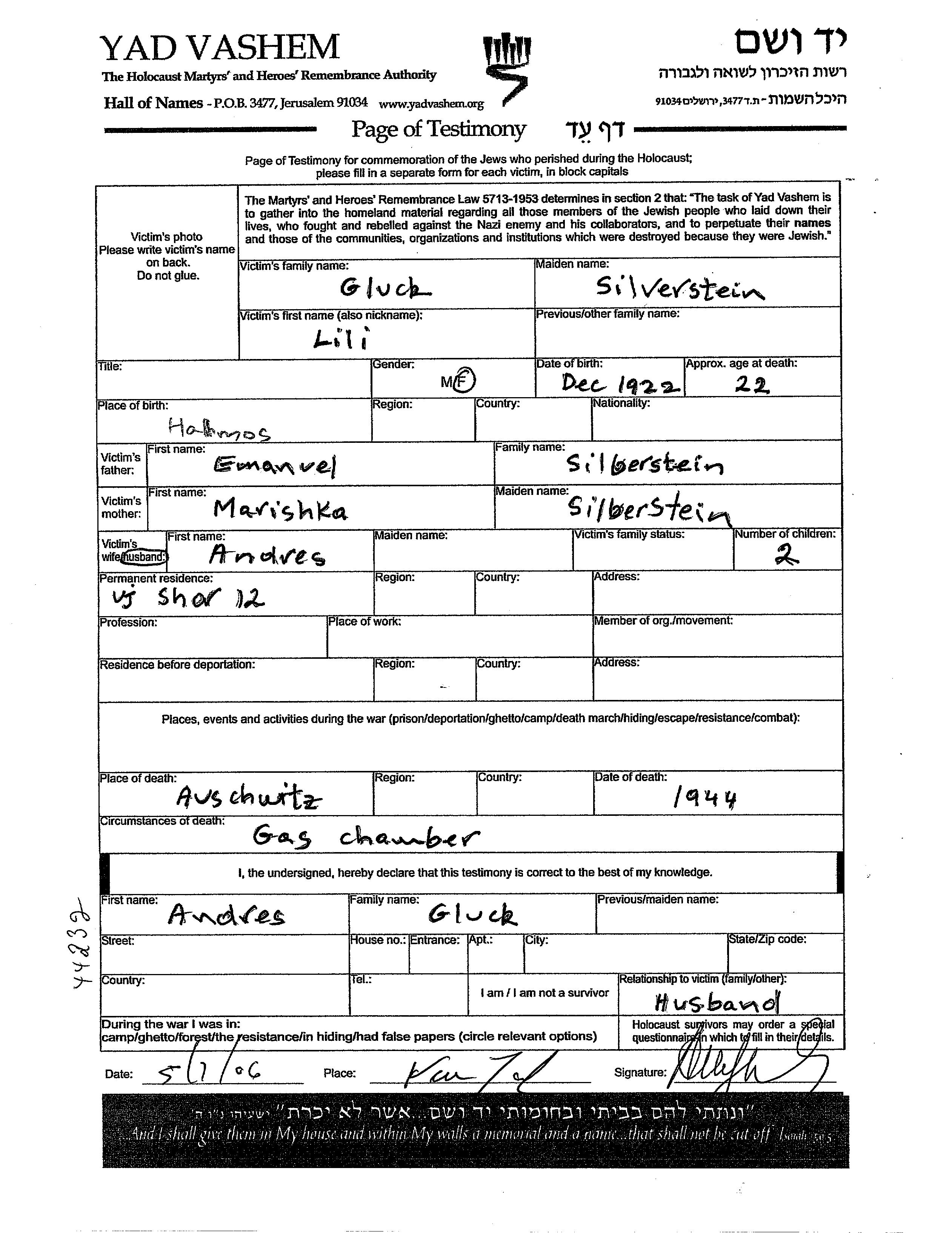 Lili Gluck, geb. Silverstein wurde im Jahr 1922 in Halmos, Tschechoslowakei geboren. Sie war die Tochter von Emanuel und Marishka. Sie war mit Andres Verheiratet.