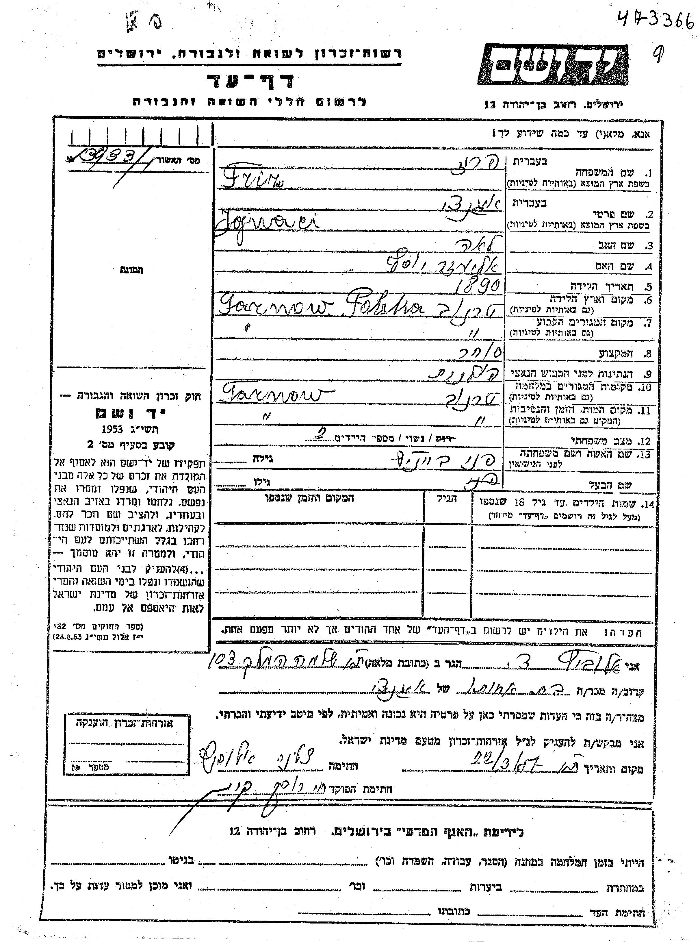 Ignaci Friz wurde im Jahr 1890 in Tarnow, Polen geboren. Er war der Sohn von Eliezer Yosef und Lea. Er war Kaufmann/-frau und mit Fani, geb. Beinish Verheiratet. Vor dem Zweiten Weltkrieg lebte er in Tarnow, Polen. Während des Krieges war er in Tarnow, Polen.