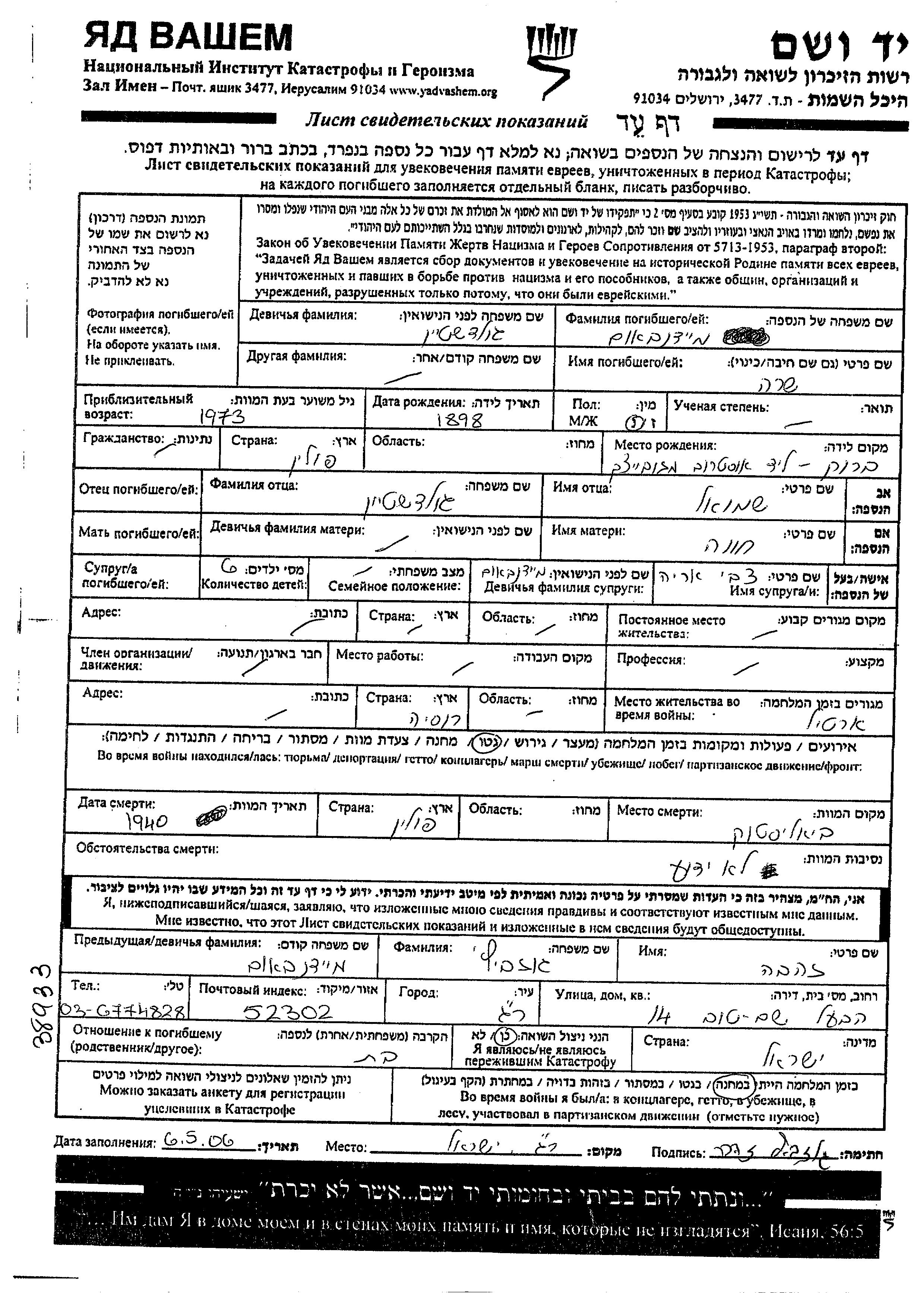 Sara Meidenbaum, geb. Goldshtein wurde in Brok, Polen geboren. Sie war die Tochter von Shmuel und Khava. Sie war mit Tzvi Arie Verheiratet. Vor dem Zweiten Weltkrieg lebte sie in Bialystok, Polen. Während des Krieges war sie in Bialystok, Polen.