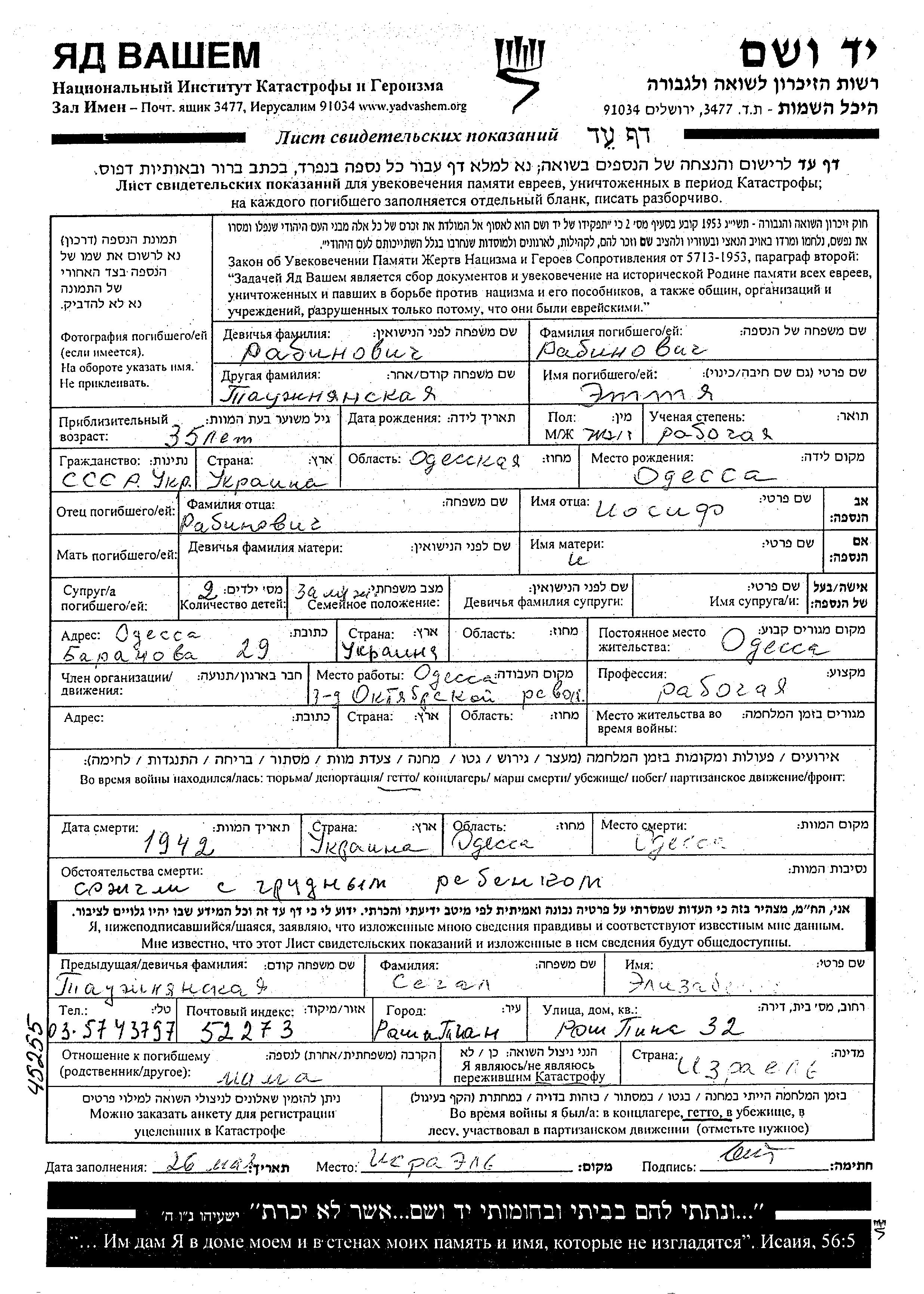 Ettya Tauzhnyanskaya, geb. Rabinovich wurde in Odessa, Ukraine (UdSSR) geboren. Sie war die Tochter von Iosif. Sie war Arbeiter/-in und Verheiratet. Vor dem Zweiten Weltkrieg lebte sie in Odessa, Ukraine (UdSSR). Während des Krieges war sie in Odessa, Ukraine (UdSSR).