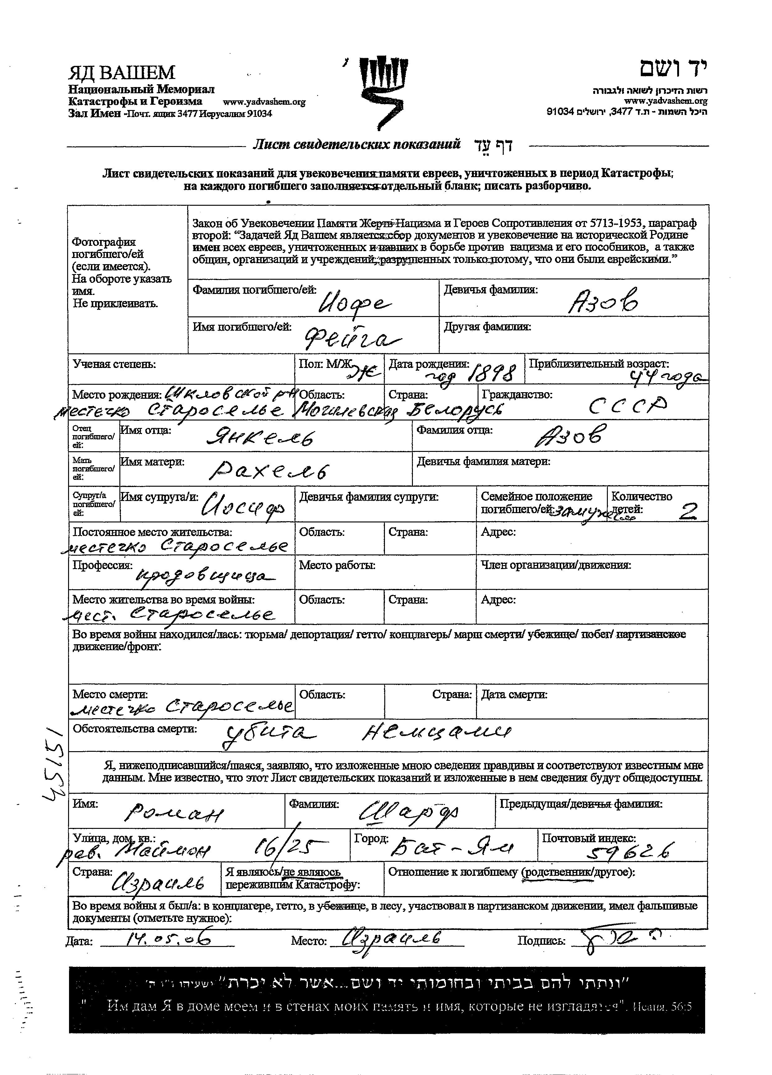 Feiga Iofe, geb. Azov wurde im Jahr 1898 in Staroselye, Weißrussland (UdSSR) geboren. Sie war die Tochter von Yankel und Rakhel. Sie war Verkäufer/-in und mit Iosif Verheiratet. Vor dem Zweiten Weltkrieg lebte sie in Staroselye, Weißrussland (UdSSR). Während des Krieges war sie in Staroselye, Weißrussland (UdSSR).