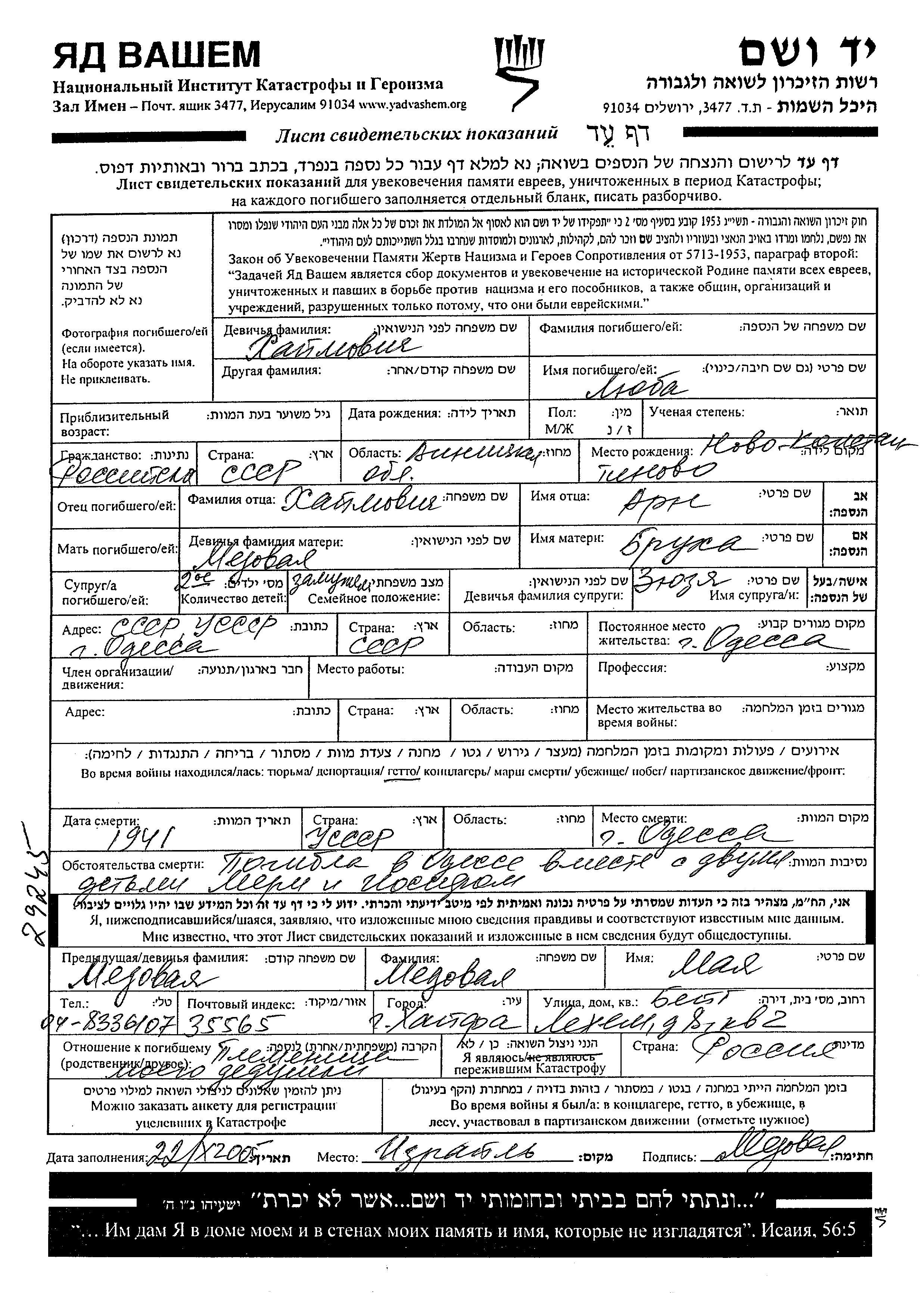 Lyuba wurde in der Schoah ermordet. Todesort: Odessa, Ukraine (UdSSR) im Jahr 1941.