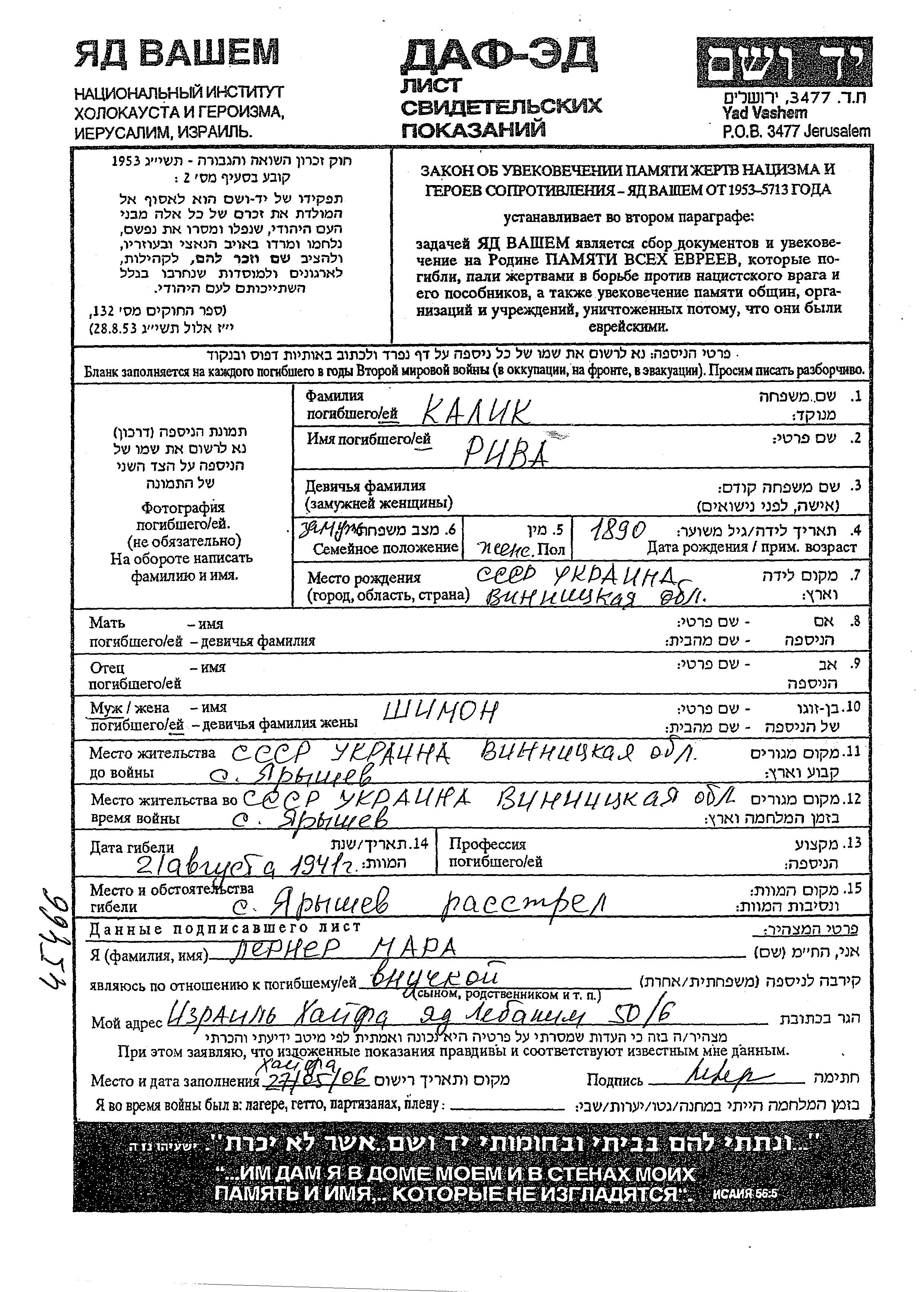 Riva Kalik wurde im Jahr 1890 in Vinnitsa, Ukraine (UdSSR) geboren. Sie war mit Shimon Verheiratet. Vor dem Zweiten Weltkrieg lebte sie in Yaryshev, Ukraine (UdSSR). Während des Krieges war sie in Yaryshev, Ukraine (UdSSR).