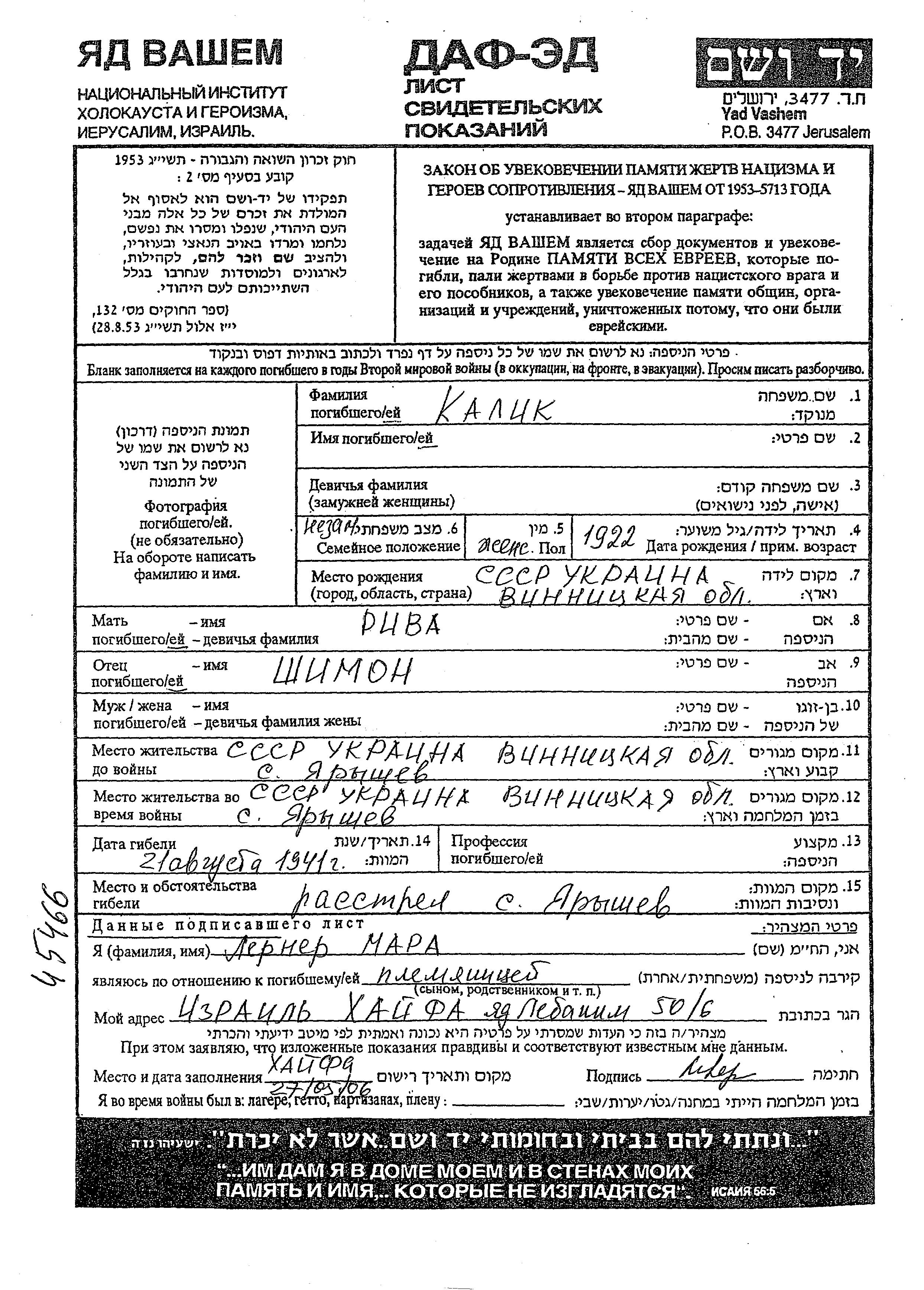 Vorname unbekannt Kalik wurde im Jahr 1922 in Vinnitsa, Ukraine (UdSSR) geboren. Sie war die Tochter von Shimon und Riva. Sie war Ledig. Vor dem Zweiten Weltkrieg lebte sie in Yaryshev, Ukraine (UdSSR). Während des Krieges war sie in Yaryshev, Ukraine (UdSSR).