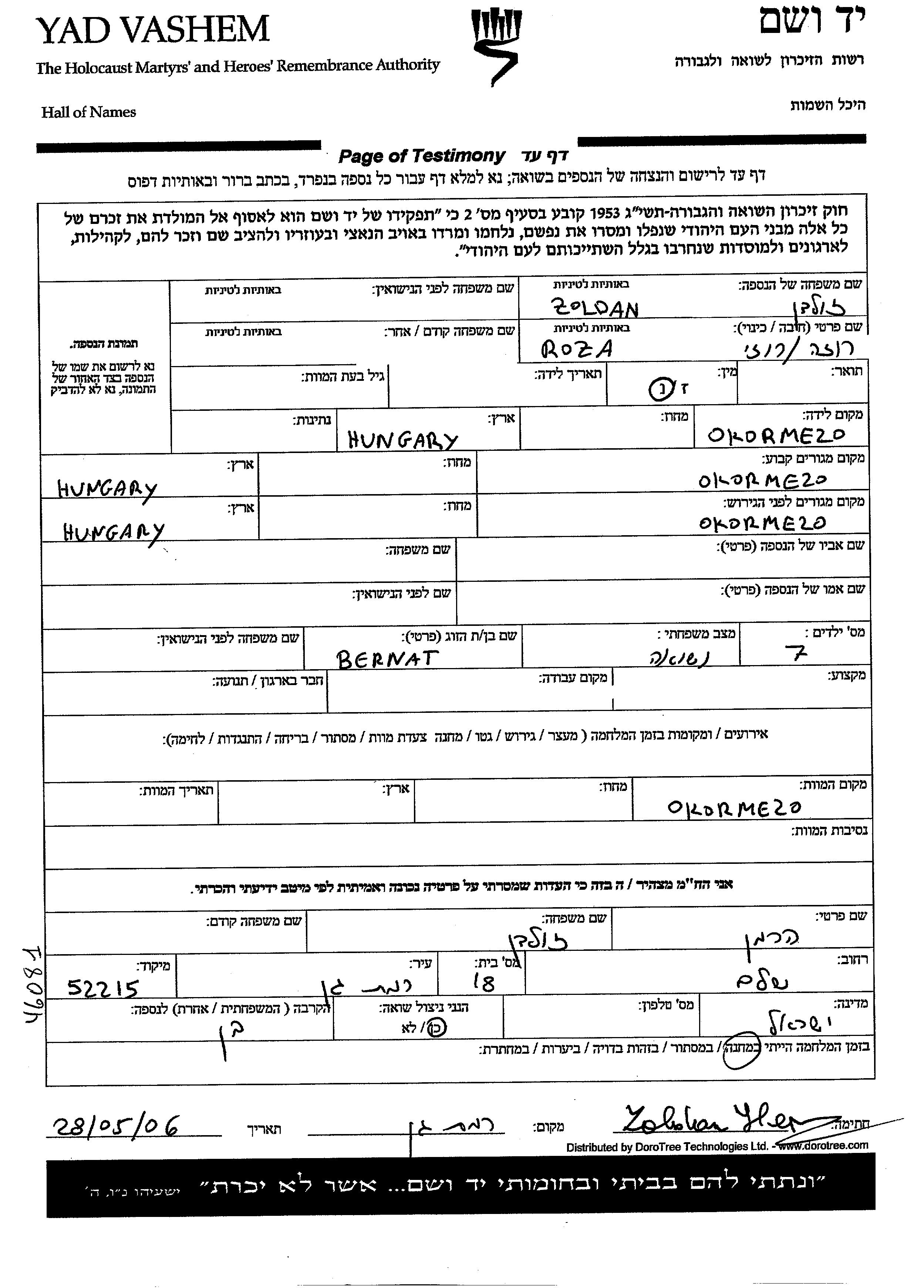 Roza Zoldan wurde in Okormezo, Tschechoslowakei geboren. Sie war mit Bernat Verheiratet. Vor dem Zweiten Weltkrieg lebte sie in Okormezo, Tschechoslowakei. Während des Krieges war sie in Okormezo, Tschechoslowakei.