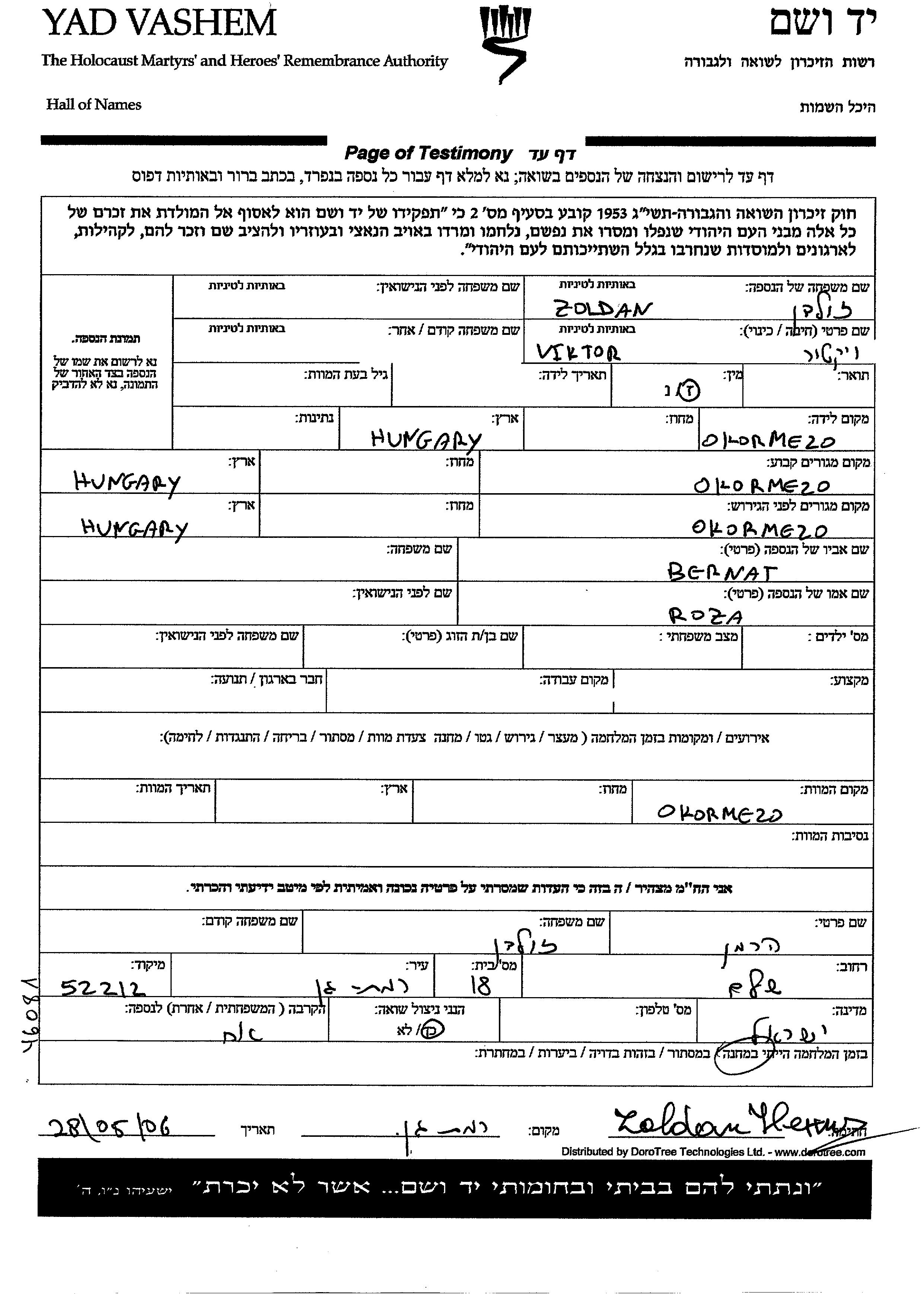 Viktor wurde in der Schoah ermordet. Todesort: Okormezo, Tschechoslowakei.