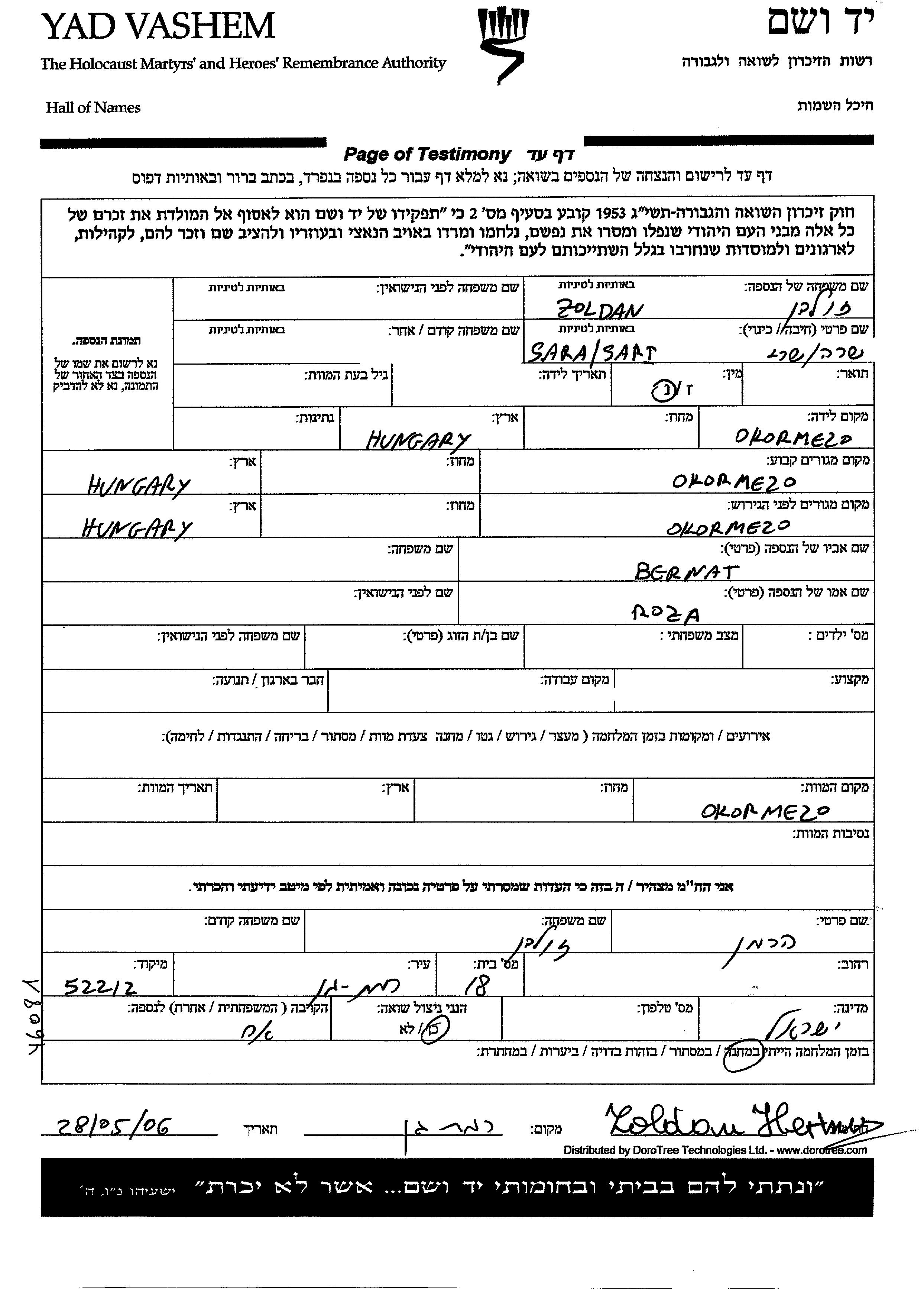 Sari wurde in der Schoah ermordet. Todesort: Okormezo, Tschechoslowakei.
