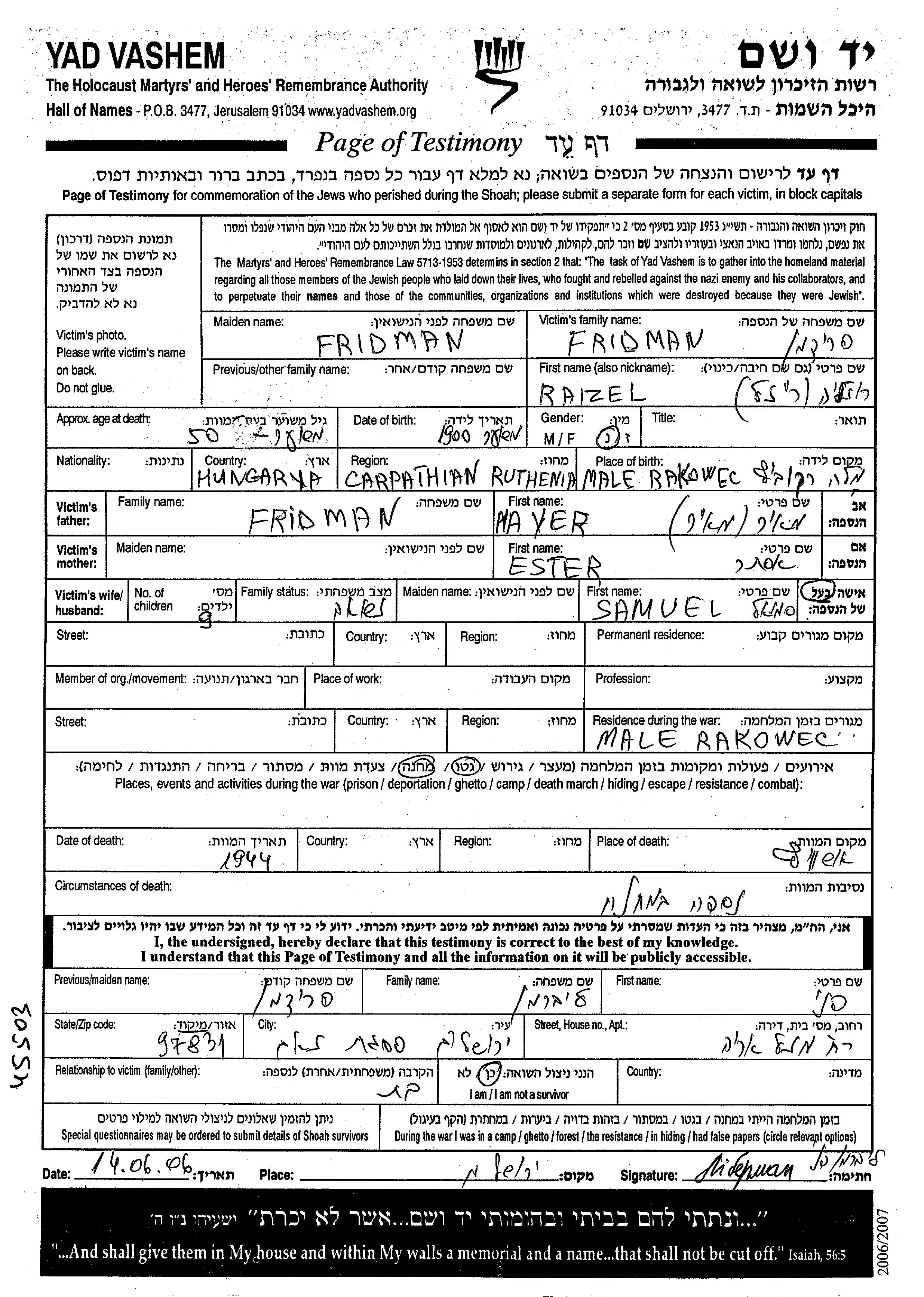 Rozalia Fridman, geb. Fridman wurde in Male Rakovec, Tschechoslowakei geboren. Sie war die Tochter von Meir und Ester. Sie war Hausfrau und mit Samuel Verheiratet. Vor dem Zweiten Weltkrieg lebte sie in Male Rakovec, Tschechoslowakei. Während des Krieges war sie in Carpathian Ruthenia, Tschechoslowakei.