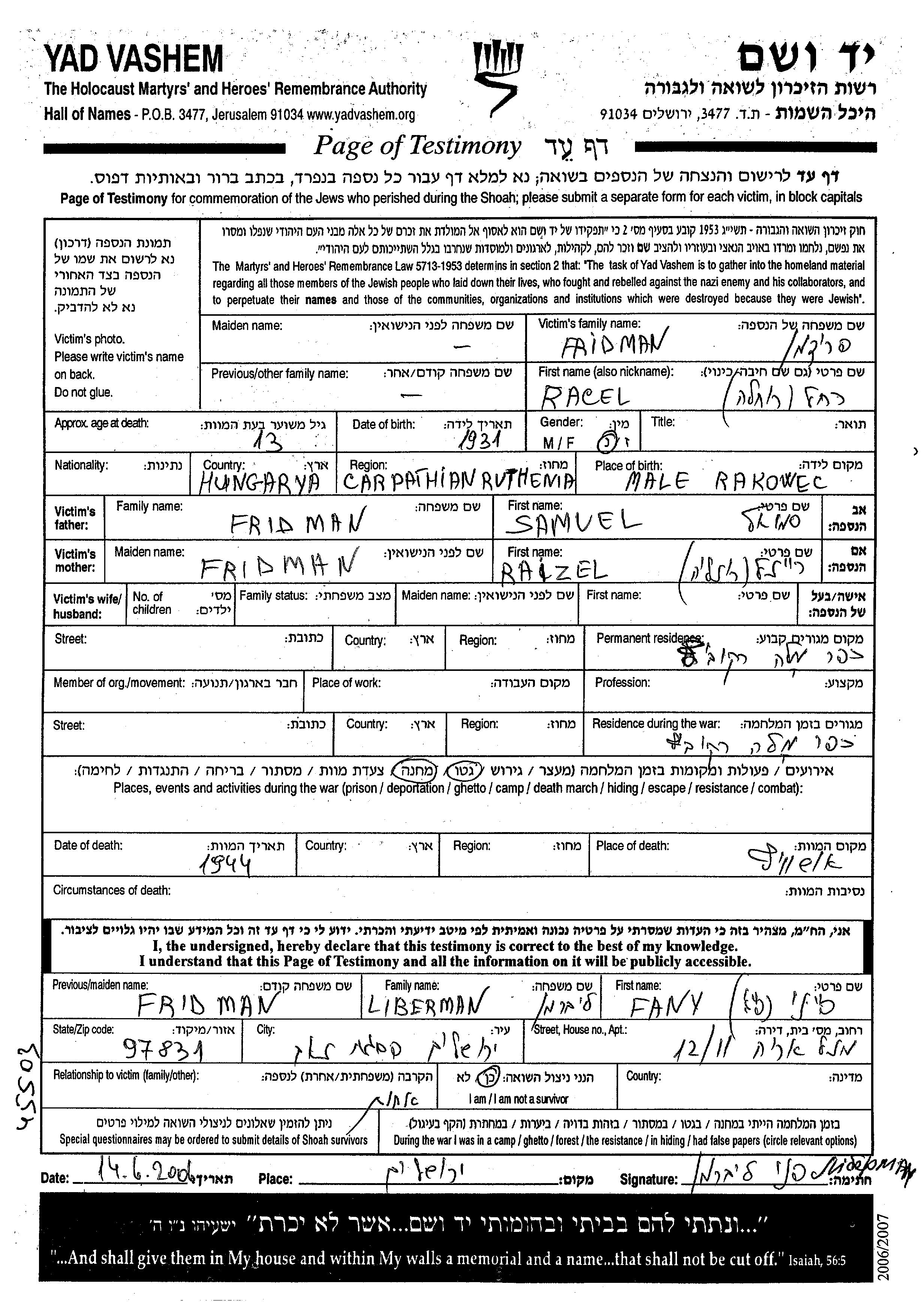 Racel Fridman wurde im Jahr 1931 in Male Rakovec, Tschechoslowakei geboren. Sie war die Tochter von Samuel und Raizl, geb. Fridman. Sie war Schüler/-in und Kind. Vor dem Zweiten Weltkrieg lebte sie in Male Rakovec, Tschechoslowakei. Während des Krieges war sie in Getto.