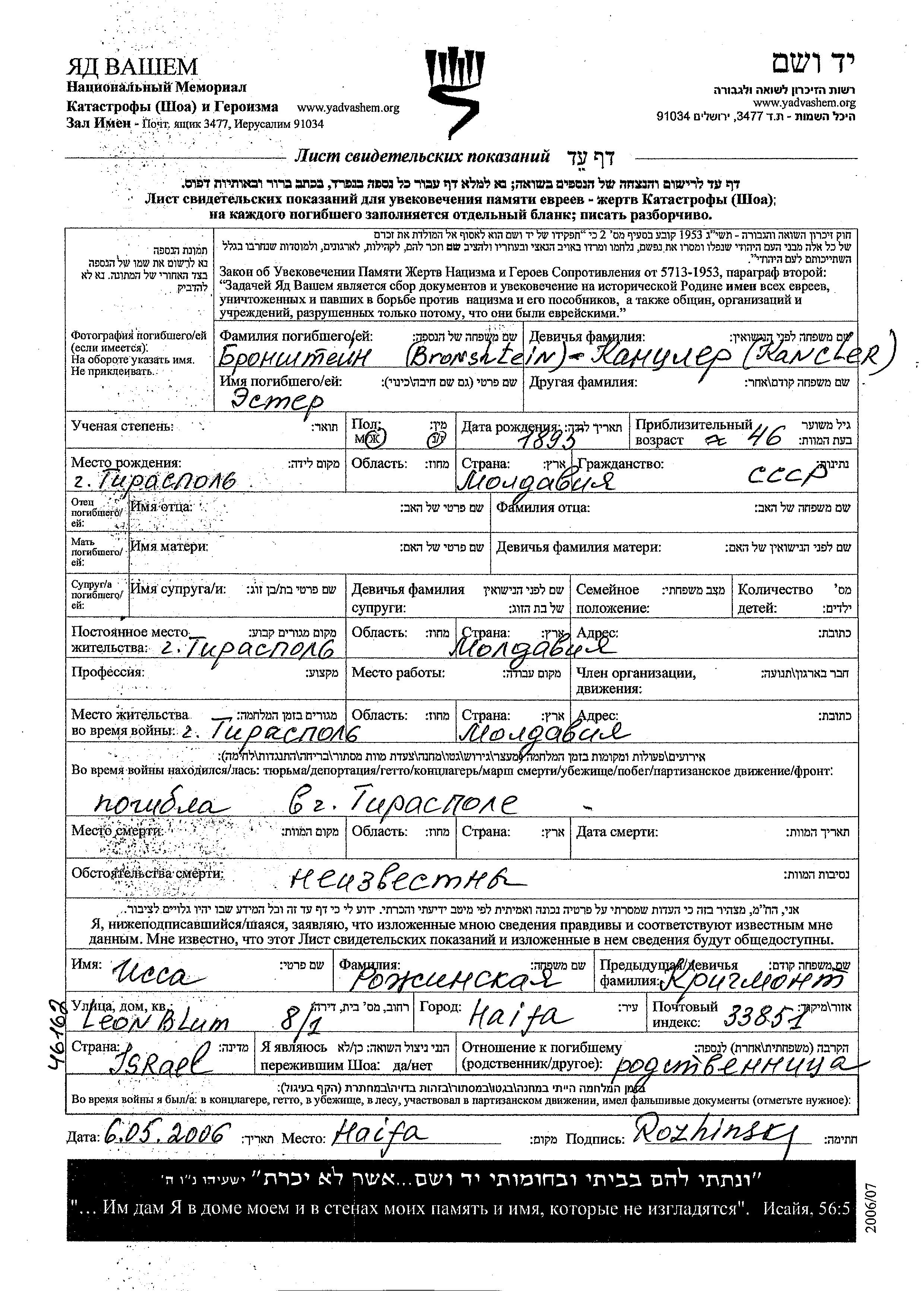 Ester Bronshtein, geb. Kancler wurde im Jahr 1895 in Tiraspol, Ukraine (UdSSR) geboren. Sie war Verheiratet. Vor dem Zweiten Weltkrieg lebte sie in Tiraspol, Ukraine (UdSSR). Während des Krieges war sie in Tiraspol, Ukraine (UdSSR).